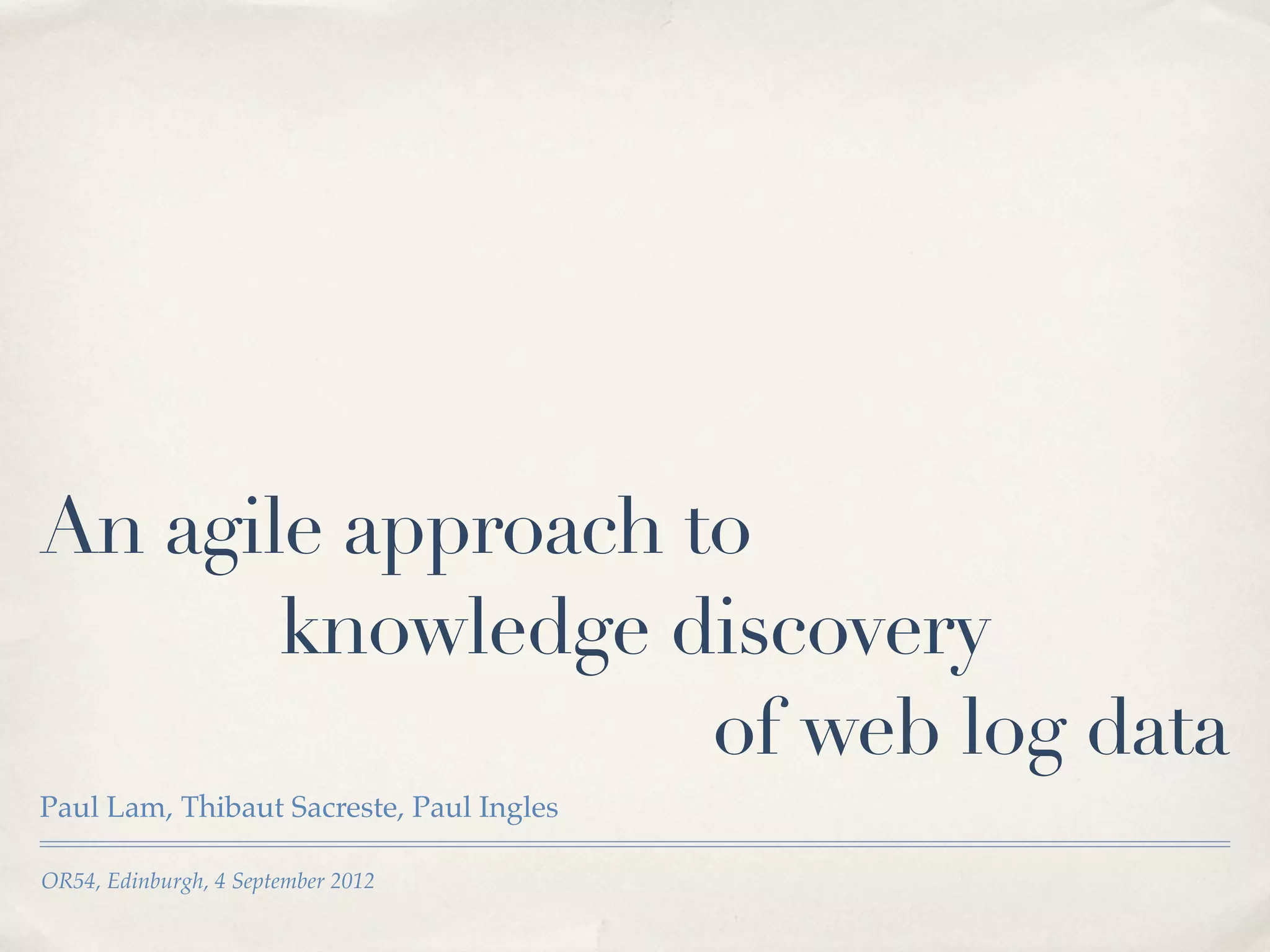 This document discusses an agile approach to analyzing web log data from uSwitch, an online business. It describes acquiring log data from many distributed applications, analyzing the data using tools like Apache Hive and Cascalog, and taking action by exposing insights to help personalize websites for visitors. The goal is to explore and exploit the data through a collaborative team that acquires, analyzes, and takes action on the data in an iterative way without unnecessary complexity.