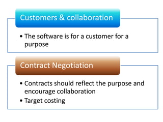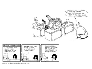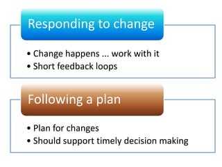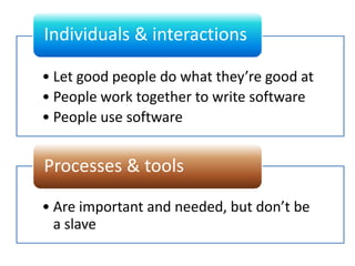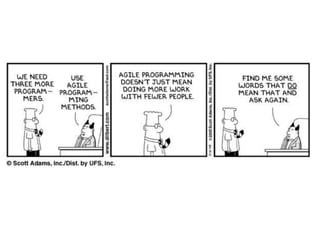This document provides an overview of Agile software development. It begins by defining Agile development as empowering people through constant feedback and acknowledging change. It then outlines the history of Agile methods from the 1970s to today. Key figures who developed methods like Scrum, Extreme Programming, and others are mentioned. The Agile Manifesto values individuals, working software, customer collaboration and responding to change. Core Agile principles are also outlined. Common Agile practices around design, testing, planning and communication are then explored. Finally, it discusses popular Agile methodologies like Scrum, XP, FDD and Lean and key themes across methods.