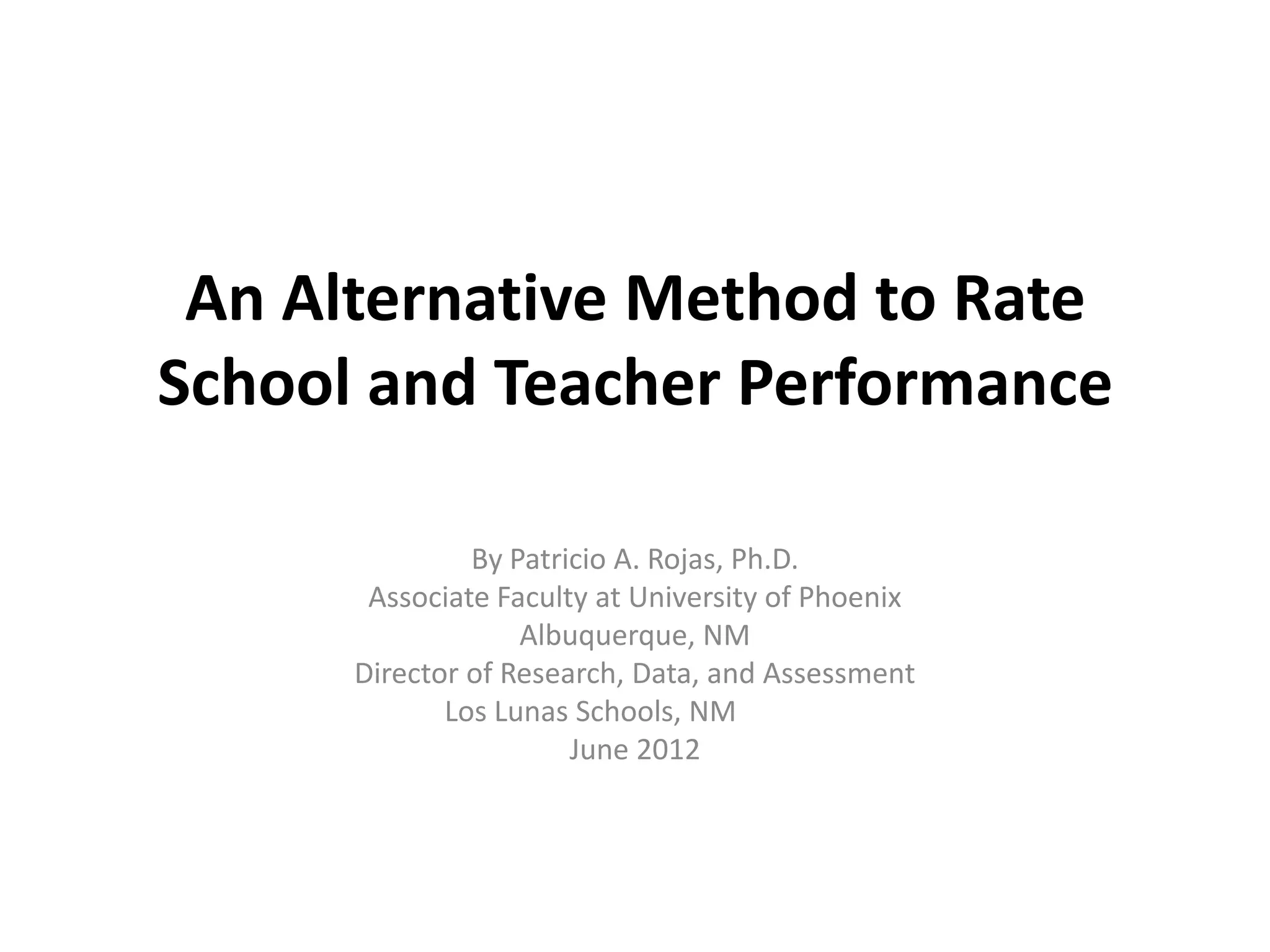 The document outlines a proposal for an alternative method to evaluate school and teacher performance in New Mexico, critiquing the current No Child Left Behind (NCLB) Act's proficiency model due to its declining effectiveness. It introduces a new combined model based on trend analysis of various performance parameters, suggesting a grading scale for institutions and educators based on their growth and proficiency metrics. The author emphasizes the need for improved understanding and implementation of educational assessments to better reflect school performance.