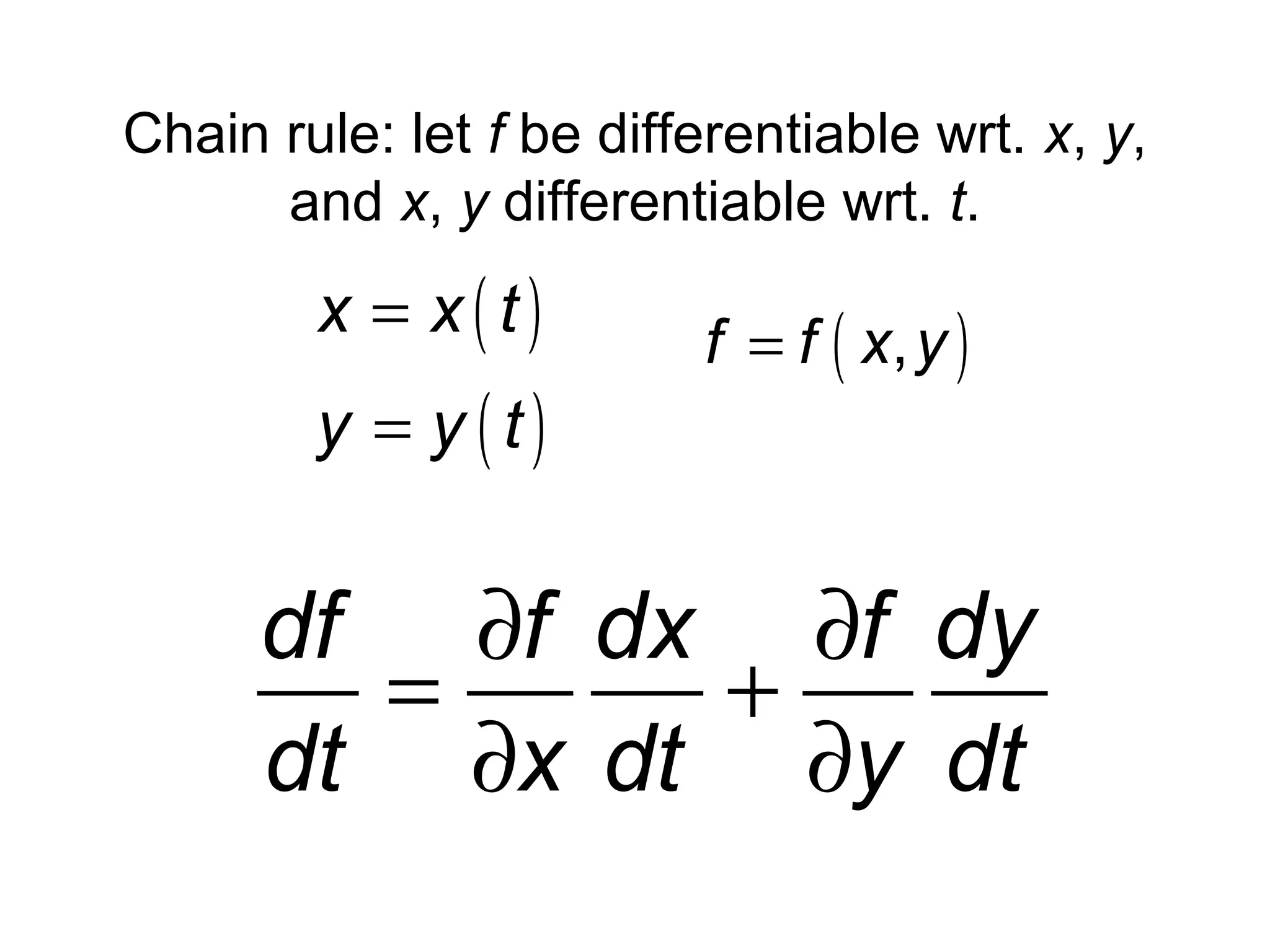This document presents an alternative proof of the chain rule for multivariable functions. It begins by defining the chain rule formula and then proves it using a new definition of differentiability. The proof shows that under the new definition, differentiability implies continuity and satisfies the chain rule. It also proves that the old definition of differentiability implies the new one, so both definitions are equivalent. The conclusion is that the old definition of differentiability is sufficient to prove the chain rule.