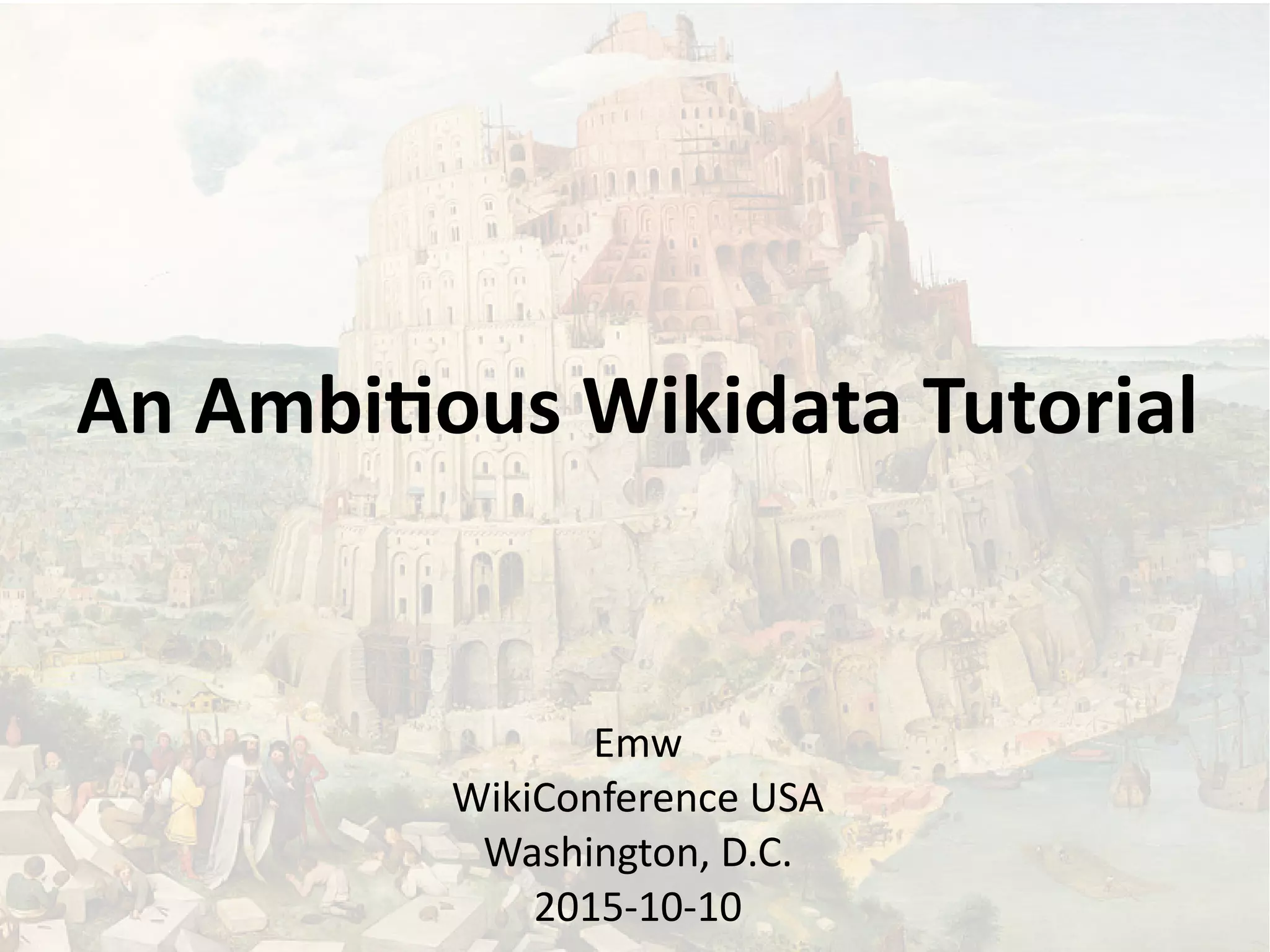 The document is a tutorial from the EMW Wikiconference discussing Wikidata as a free knowledge base, detailing its goals and structure, including items, properties, and statements. It explains how to edit Wikidata and introduces its API, querying with SPARQL, and various projects built on Wikidata. Additionally, it covers classification, causation modeling, and practical examples involving politicians and historical events.