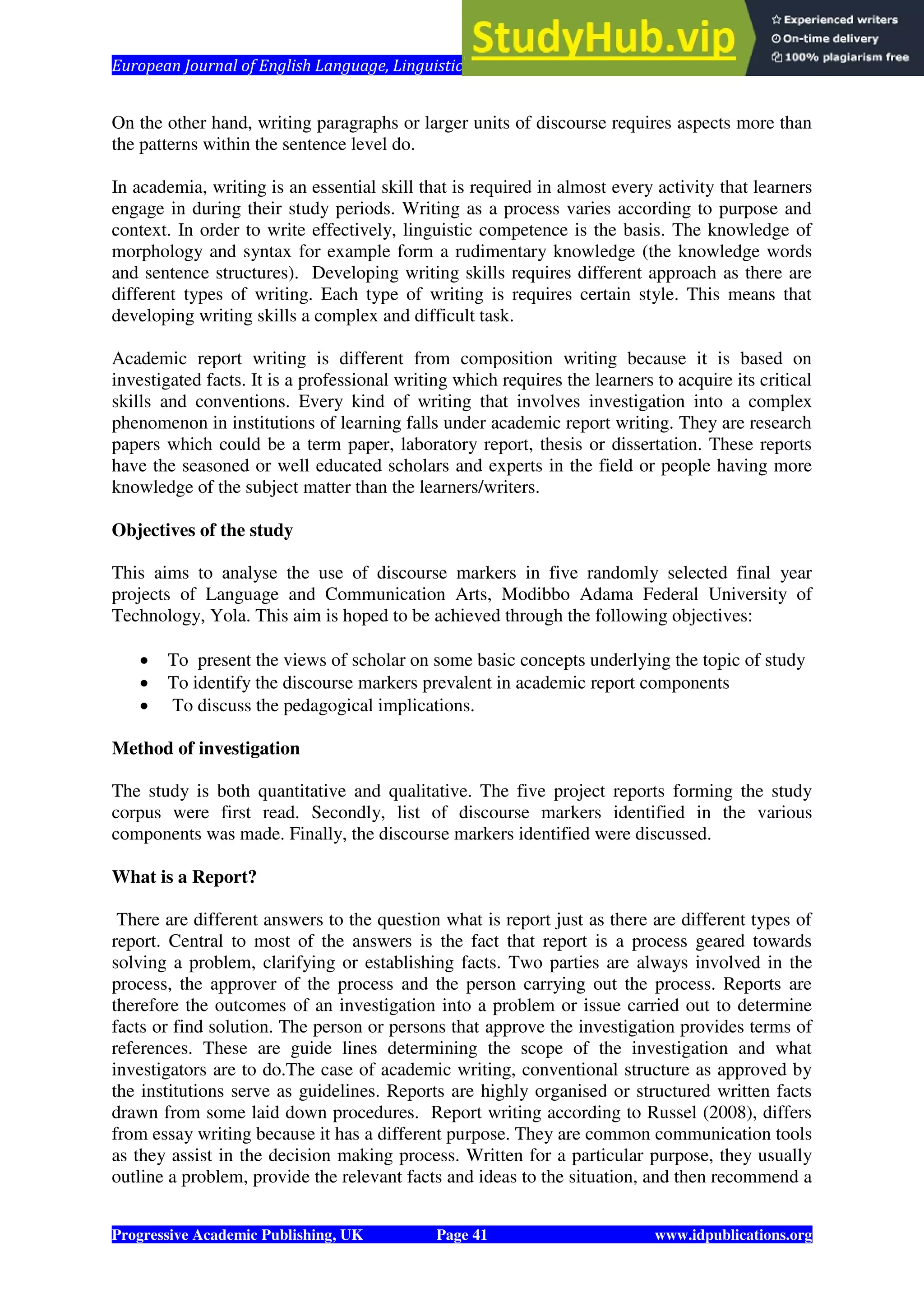 This document discusses discourse markers and their importance in academic report writing. It begins by defining academic report writing and its purpose of investigating and presenting facts for a professional audience. The document then discusses discourse/discourse analysis, which examines how components of language cohere to effectively communicate. Finally, the document emphasizes the need for teaching and proper use of discourse markers to enhance coherence and effectiveness in academic report writing.