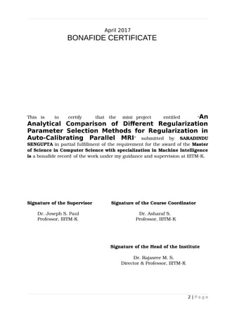 This document presents an analytical comparison of various regularization parameter selection methods for auto-calibrating parallel MRI, focusing on the GRAPPA and SPIRiT techniques. It evaluates the performance of spectral cut-off regularization using methods like L-curve and generalized cross-validation, detailing experiments conducted on volunteer data sets. The study aims to determine optimal regularization parameters to enhance image reconstruction in parallel MRI, highlighting key findings on noise propagation and image quality.