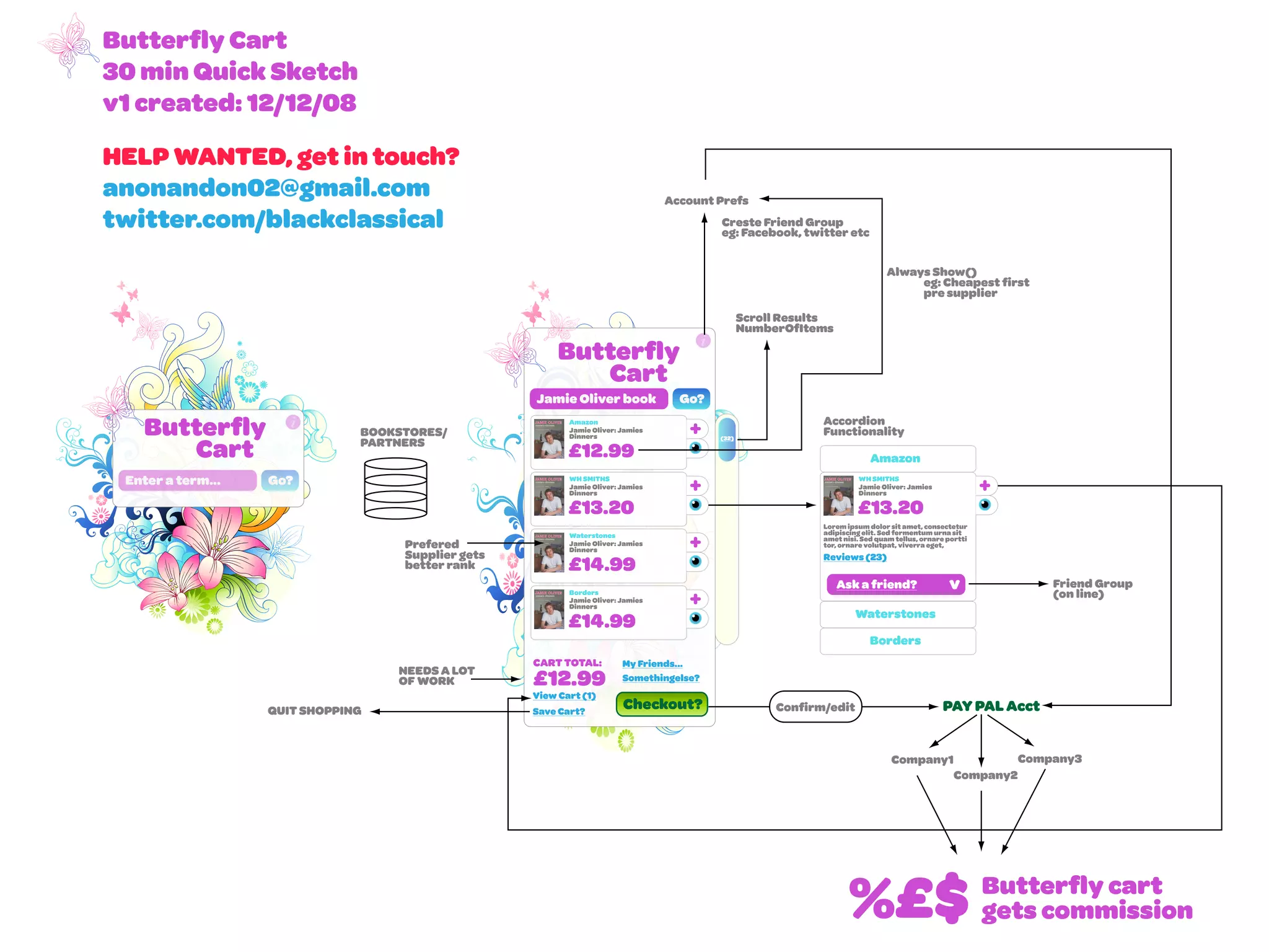 The document outlines a draft for a shopping cart feature named 'butterfly cart,' including functionalities for item searching, partner pricing, and checkout options. It also displays various book options by Jamie Oliver with different prices from multiple suppliers. The document notes the need for further improvements and a contact email for assistance.