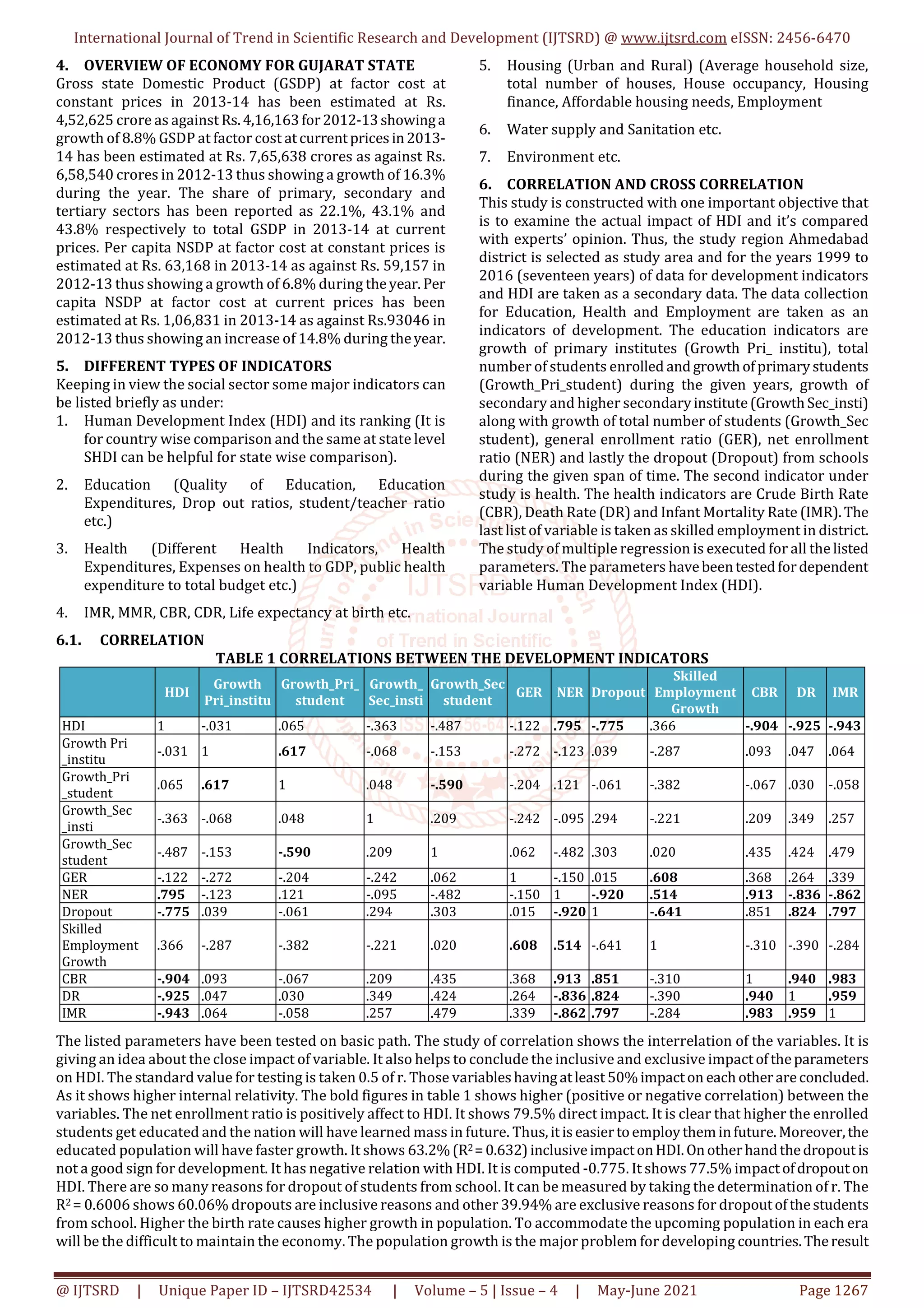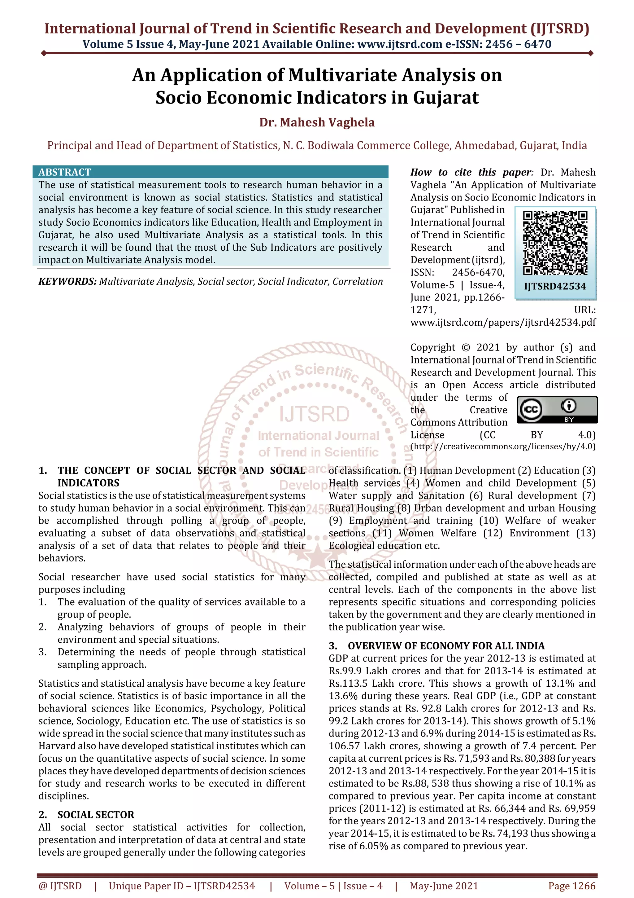 The study by Dr. Mahesh Vaghela analyzes socio-economic indicators in Gujarat using multivariate analysis, focusing on education, health, and employment. It finds positive impacts of various sub-indicators on the Human Development Index (HDI), while factors like student dropouts, high birth, and death rates have negative correlations with HDI. The research highlights the importance of education and skilled employment as pivotal to socio-economic growth in the region.