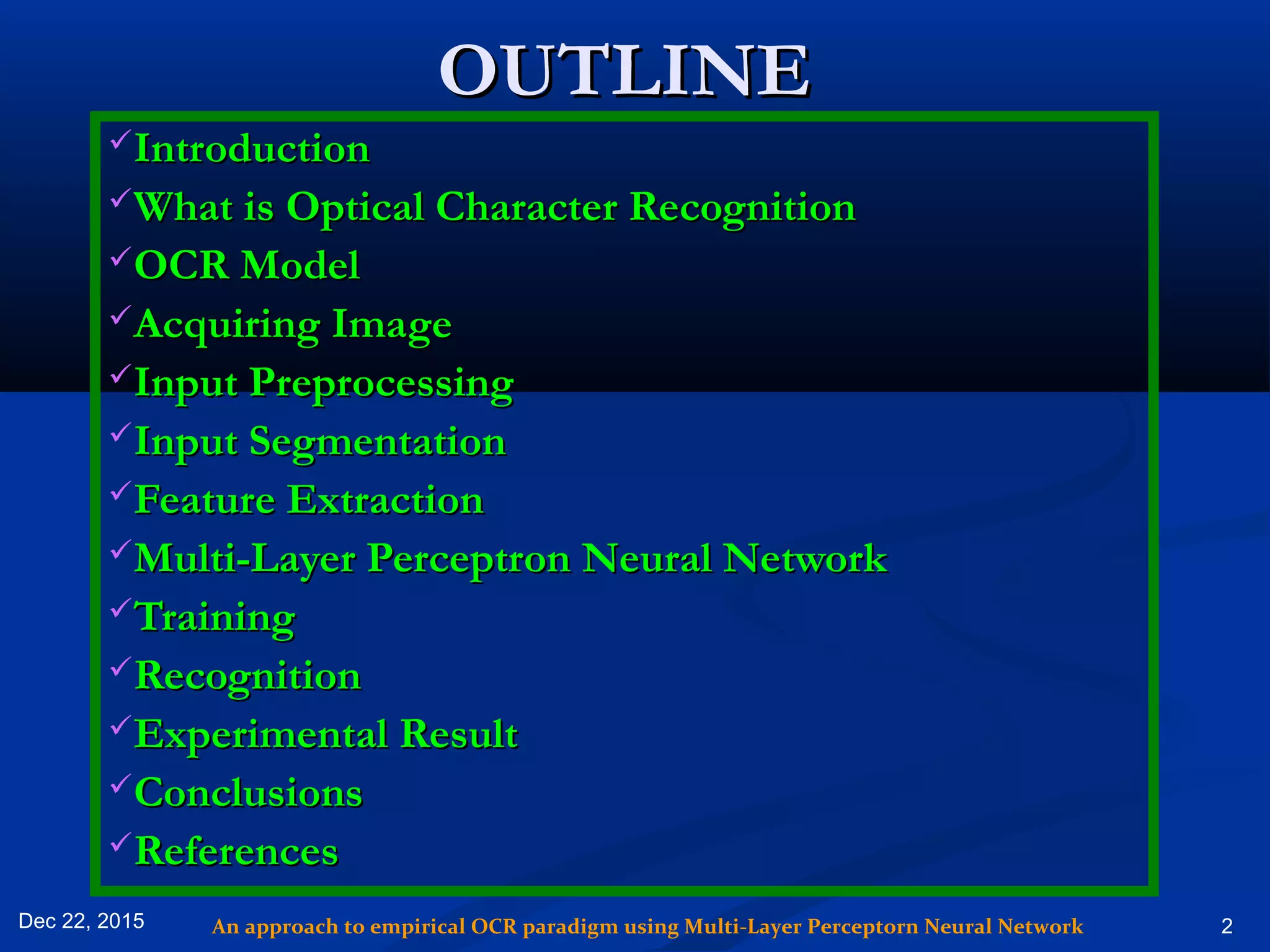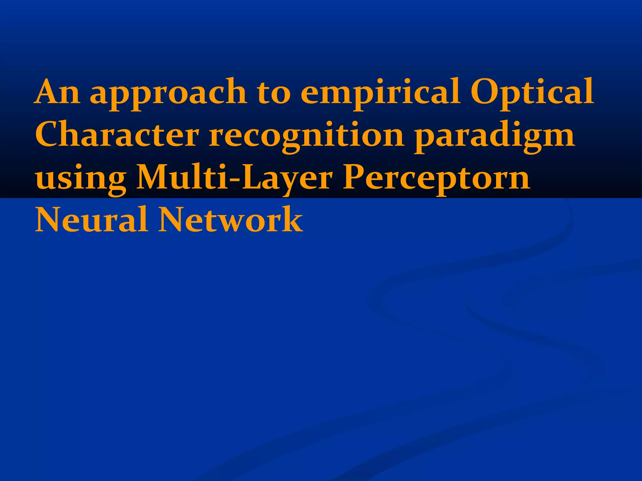 An artificial neural network approach to optical character recognition (OCR) is presented using a multi-layer perceptron model. The model acquires an image, preprocesses it through steps like grayscale conversion and segmentation, extracts features by mapping characters to matrices, then trains a neural network to classify characters. Experimental results show 91.53% accuracy for isolated characters and 80.65% for characters in sentences.