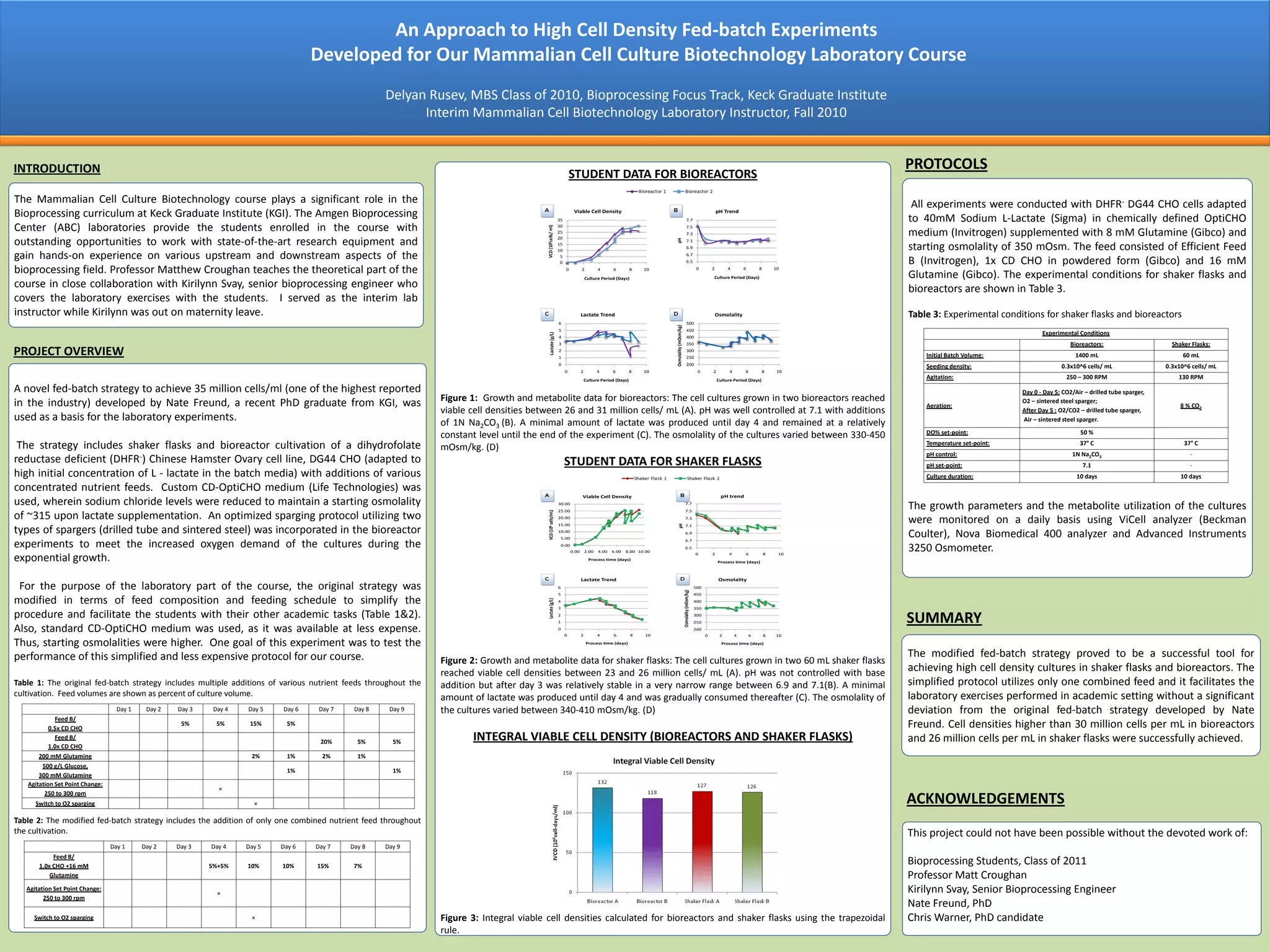 The document outlines a high cell density fed-batch strategy for a mammalian cell culture biotechnology course at Keck Graduate Institute, detailing experimental protocols and conditions that lead to successful cultivation of CHO cells. It describes the use of various bioreactor configurations, nutrient feeds, and modifications to simplify the process for student experiments. The modified strategy allowed for the achievement of viable cell densities surpassing 30 million cells/ml in bioreactors and 26 million cells/ml in shaker flasks.