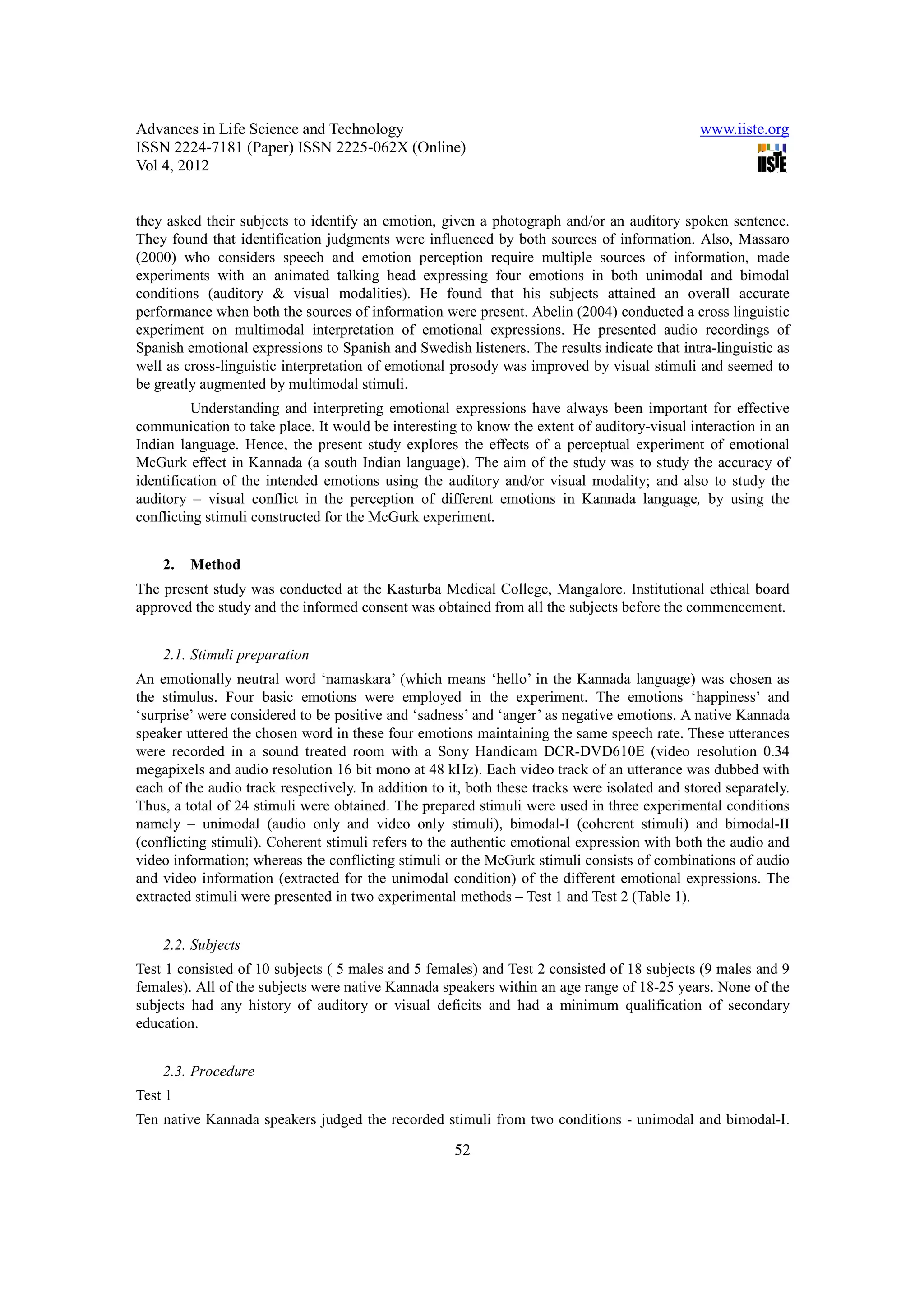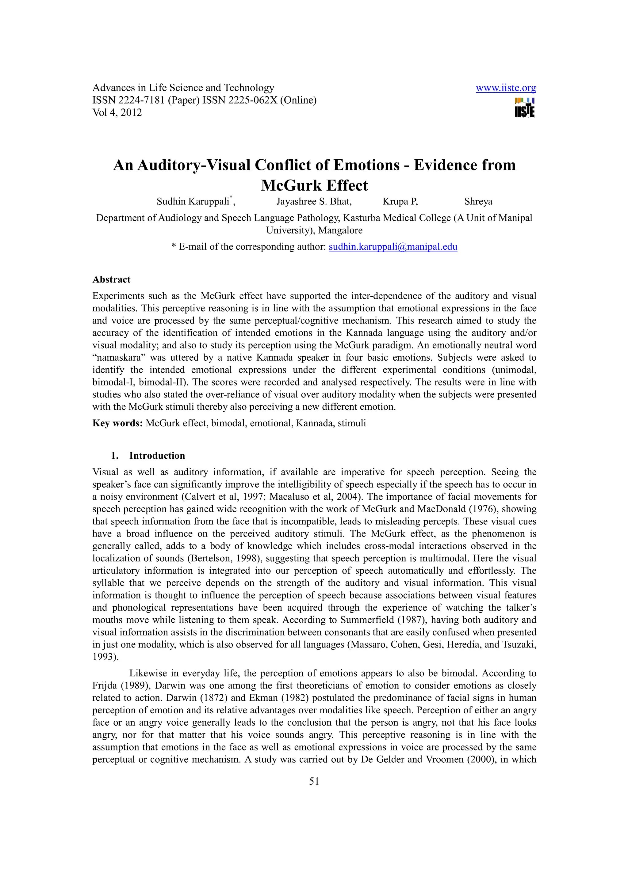 This document summarizes a study that examined the McGurk effect for emotions in the Kannada language. Researchers created audio and video recordings of a speaker producing the word "namaskara" in four emotions (happiness, surprise, sadness, anger). Subjects viewed these recordings in isolated and combined formats and identified the intended emotions. Results showed subjects relied more on visual information when audio and video emotions conflicted, sometimes perceiving a new emotion. The study aimed to understand auditory-visual processing of emotions in an Indian language and provide evidence the McGurk effect applies to emotional perception as it does speech sounds.