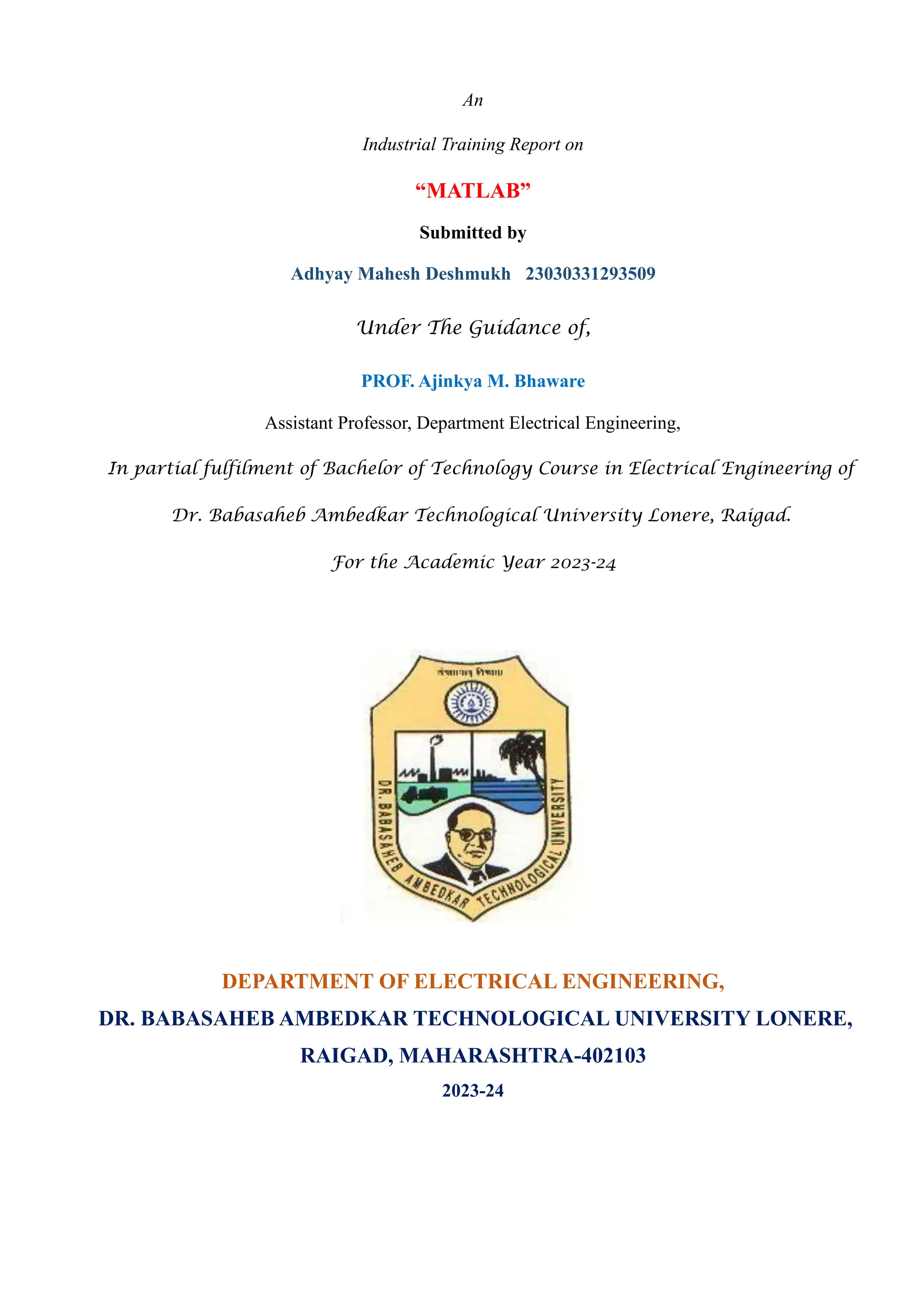 The document is an industrial training report on MATLAB submitted by Adhyay Mahesh Deshmukh as part of his Bachelor of Technology in Electrical Engineering at Dr. Babasaheb Ambedkar Technological University. It describes the MATLAB Onramp course, which provides an introduction to MATLAB's interface, programming concepts, data analysis, and visualization techniques, aimed at beginners. The report highlights the course's interactive nature and its practical applications in scientific and engineering tasks, laying a foundation for further exploration of MATLAB's capabilities.