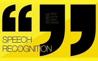 The document discusses a team's project on developing speech recognition technology to help the deaf and hard of hearing community communicate. It outlines 3 phases: Phase 1 involves speech to text transcription, Phase 2 adds translating speech to sign language, and Phase 3 aims to enable two-way conversation between deaf and hearing individuals by translating between sign language and spoken language. The team identifies stakeholders, potential use cases, competitors' products, and next steps to further develop the technical feasibility and design of the phases, especially the complexity of bidirectional translation.
