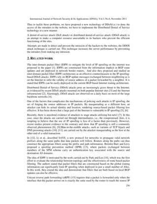 This document summarizes an algorithm called the GI (Group Intruders) Time Frequency Algorithm that is proposed to identify hackers attempting distributed denial of service (DDoS) attacks on websites. The algorithm works by maintaining a history of all user access to the site that includes their IP address and time/date of each access. It identifies users that access the site repeatedly from the same IP address on a single date by calculating the average time between accesses. If the time frequency of accesses exceeds a predefined threshold, the user is added to an intruders list to deny future access. This aims to improve server performance by preventing hackers from overloading the server with requests.