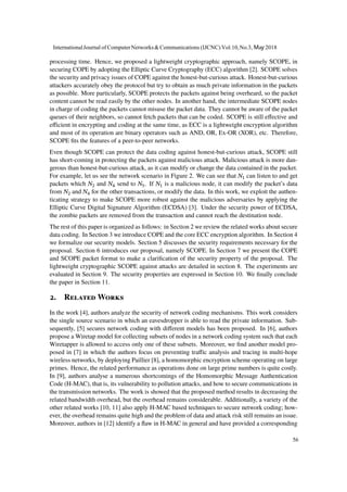 This document introduces a lightweight cryptographic solution, named SCOPE, to enhance the security of the Coding Opportunistically (COPE) protocol in peer-to-peer wireless networks against both honest-but-curious and malicious attacks. The SCOPE approach employs elliptic curve cryptography for encryption and elliptic curve digital signature algorithm for authentication, ensuring the privacy and integrity of coded data packets while maintaining efficiency in bandwidth usage. The work discusses security requirements, threat models, and the implementation of the new protocol to safeguard data in transit through the network.
