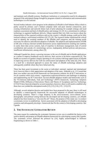 This document provides a summary of a systematic literature review conducted to establish factors for developing an eHealth adoption framework for developing countries. The review analyzed 29 papers published between 2009-2021 on eHealth adoption frameworks in developing nations. The most commonly used frameworks were TAM, UTAUT, and TOE, but additional factors were identified. Based on the findings, the researchers derived a novel 8-dimension eHealth adoption framework for developing countries including socio-demographic, technology, information, socio-cultural, organization, governance, ethical/legal, and financial dimensions. Key factors identified included perceived usefulness/ease of use, cultural dimensions, organizational fit, reinforcement, age/education, financial support, and policy/regulatory