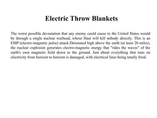 An EMP attack using a nuclear warhead detonated high above the Earth could damage electrical infrastructure across wide areas. Such an attack was first observed when a nuclear test in the South Pacific damaged streetlights in Hawaii over 1,300 km away. While terrorists could potentially launch an EMP attack against the US using a missile, accurately weaponizing a small nuclear bomb and achieving sufficient range would be very difficult. The nation's power grid is also vulnerable to cyber attacks, as evidenced by the Stuxnet virus damaging Iran's nuclear facilities despite being disconnected from the internet. Various solar, cyber, and infrastructure threats could potentially disrupt electricity availability.