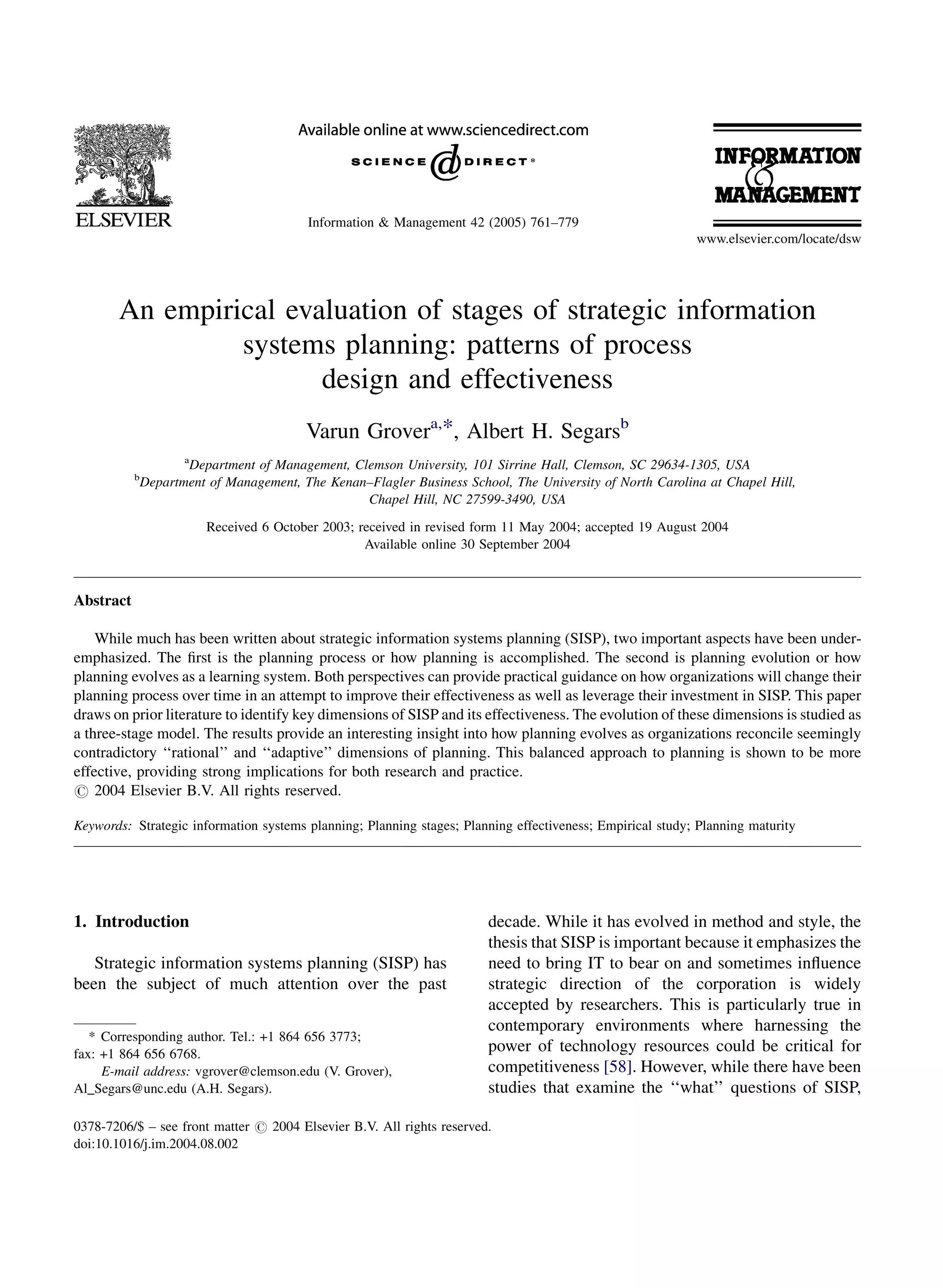 This document discusses a study that empirically evaluated stages of strategic information systems planning (SISP) processes and their effectiveness. The researchers identified key dimensions of SISP processes, including comprehensiveness, formalization, focus, flow, participation, and consistency. They proposed a three-stage model of SISP evolution where these dimensions change over time. The study found that planning processes exhibiting characteristics of both rationality and adaptability tended to be more effective, providing a balanced approach. This provided implications for how organizations can improve their SISP processes and effectiveness over multiple stages of planning maturity.