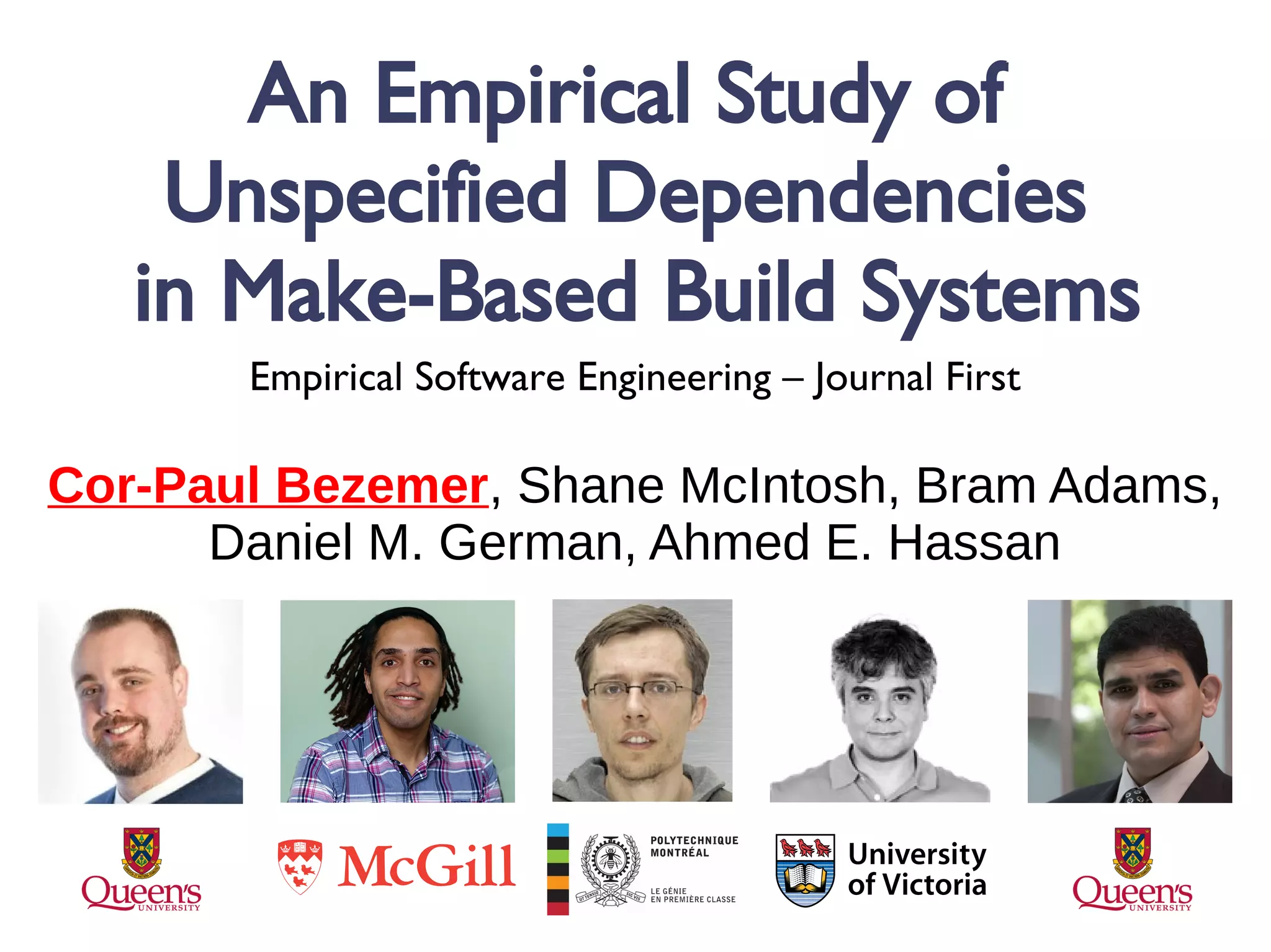 This document presents an empirical study of unspecified dependencies in make-based build systems, exploring how these can lead to significant issues in the build process. It discusses the prevalence of such dependencies in various projects and introduces a prototype tool designed to compare conceptual and concrete build graphs to identify problems. The findings reveal that developers often prefer to omit certain dependencies to expedite builds, despite the potential for future complications.