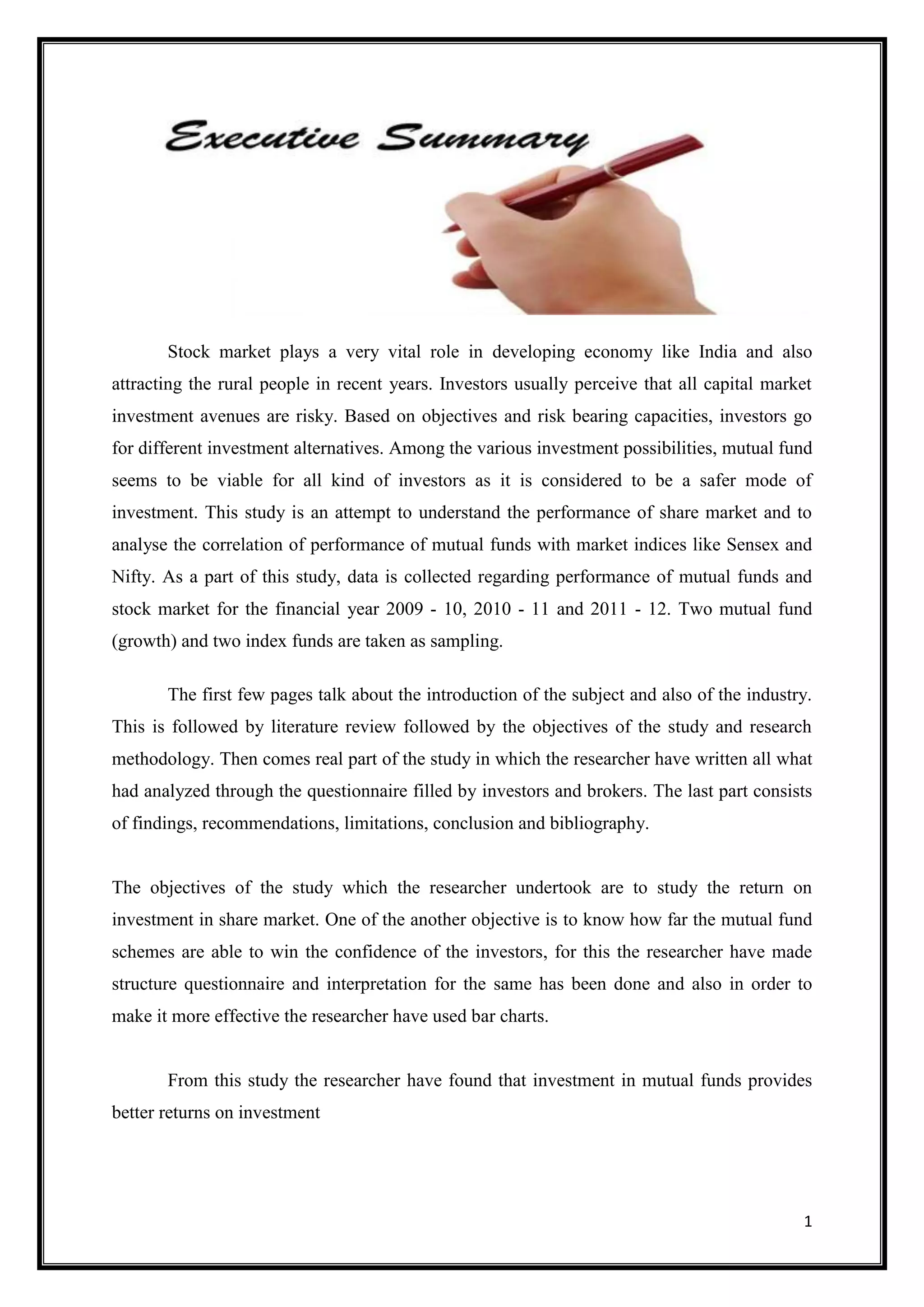 This document discusses mutual funds and stock markets in India. It provides background on mutual funds, describing them as investment vehicles that pool money from investors to purchase a variety of securities. The document then discusses the objectives of the study, which are to analyze returns from investing in stock markets and examine how well mutual fund schemes attract investor confidence. It also describes the methodology used, including collecting performance data on mutual funds and market indices from 2009-2012 and analyzing two mutual funds and two index funds.