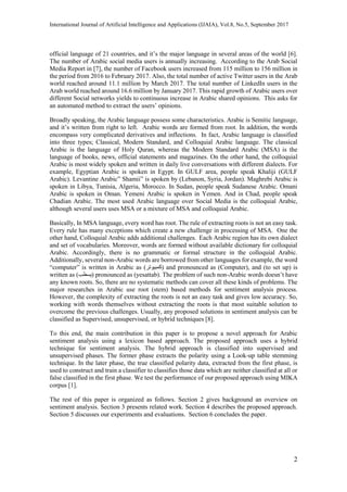 This document presents a novel hybrid approach for Arabic sentiment analysis that combines both unsupervised and supervised techniques. The approach utilizes a look-up table stemming technique in the unsupervised phase to extract data polarity, while the supervised phase uses true classified polarity data to train classifiers for further analysis. The proposed method is evaluated using the Mika corpus, demonstrating improved results over existing sentiment analysis methods for the complex characteristics of the Arabic language.