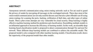 An ensemble deep neural network model was proposed to detect onion-routed traffic to improve cloud security. The model uses a combination of convolutional and recurrent neural networks along with transfer learning. It was able to detect Tor traffic with over 97% accuracy, outperforming existing methods. This helps cloud providers better monitor network traffic and identify potential threats.
