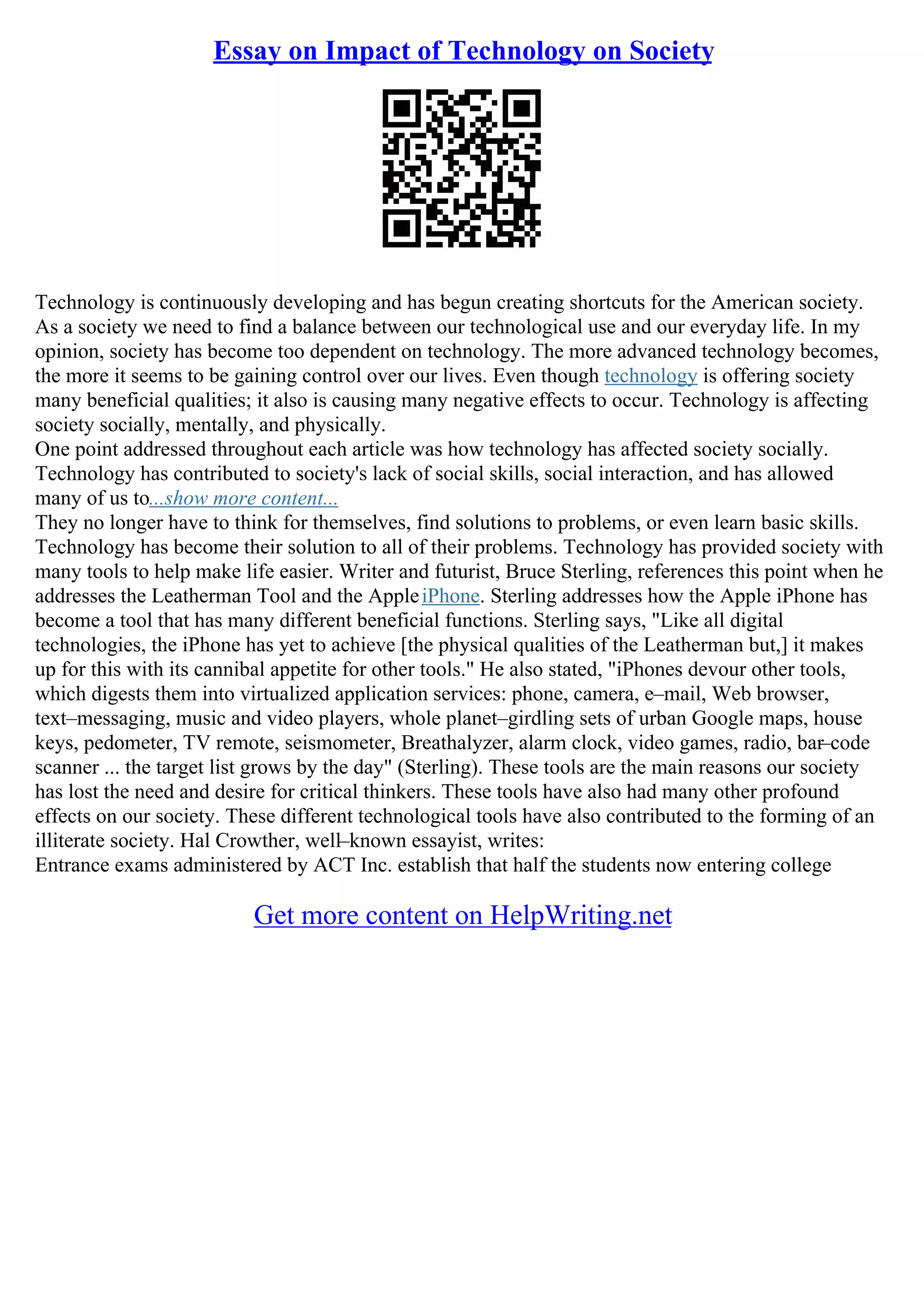 The document discusses the dual impact of technology on society, highlighting its benefits in improving efficiency and convenience while also noting a growing dependence that may hinder critical thinking, social skills, and physical activity. It addresses how technology has transformed education through tools such as computers and online resources but warns of potential negative effects on students' cognitive abilities and interpersonal interactions. Ultimately, the piece emphasizes the need for a balanced approach to technology use to mitigate its adverse consequences.