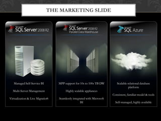 This document summarizes a presentation about new features in SQL Server 2008 R2 including managed self-service BI, multi-server management, virtualization support, power pivot for Excel, reporting services improvements, master data services, and installing SQL Server on Windows Server Core.