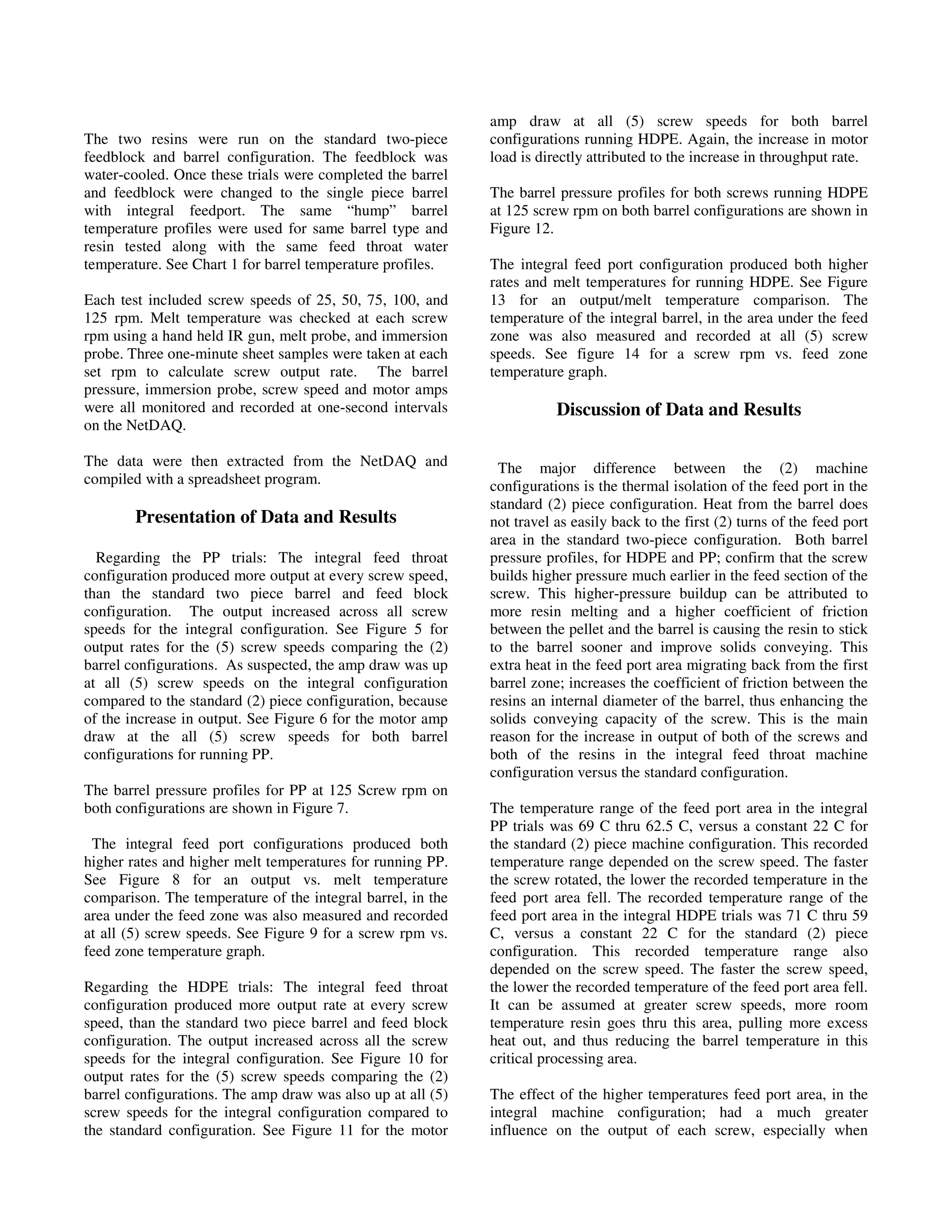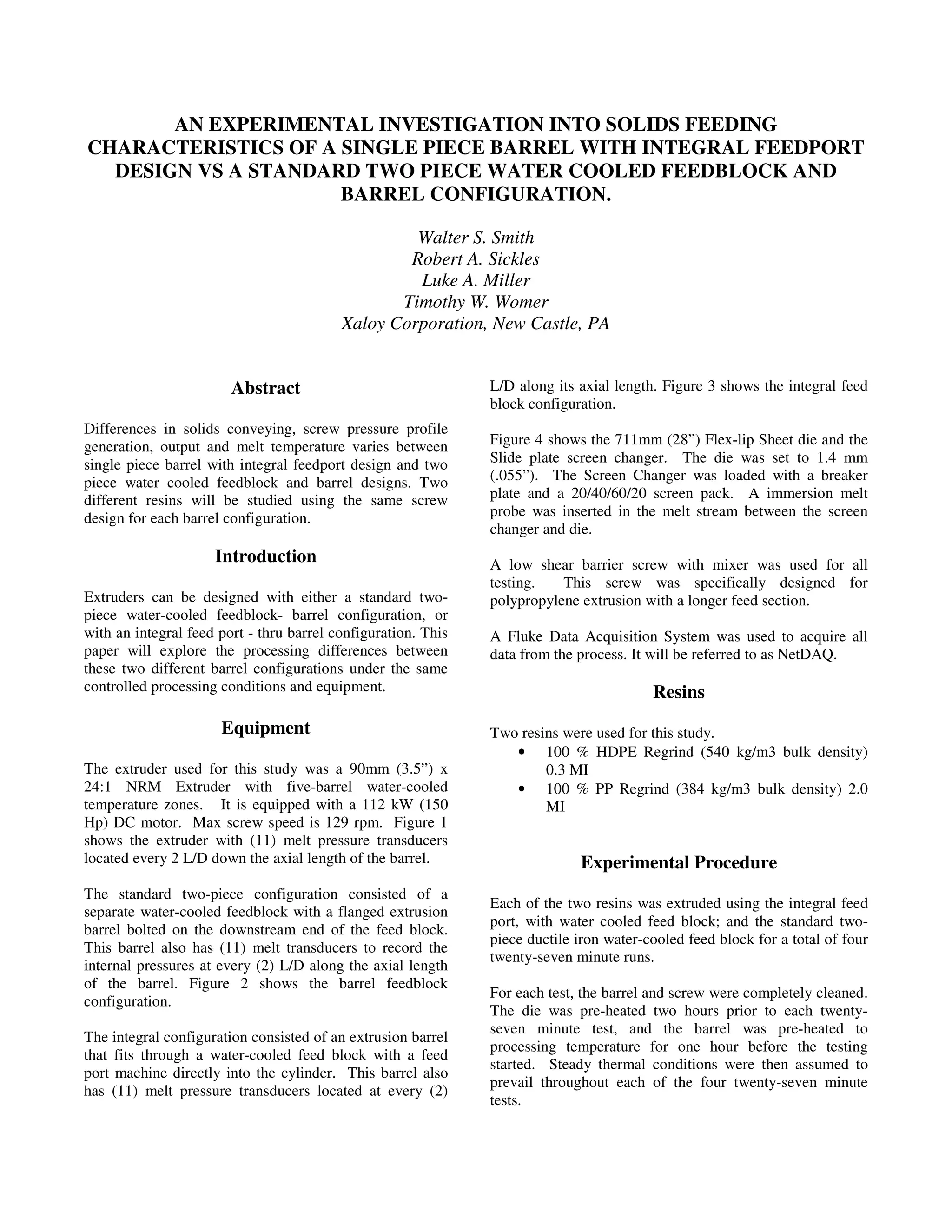 1. An experimental study compared the performance of an extruder with a single-piece barrel and integral feedport design to a standard two-piece barrel configuration.