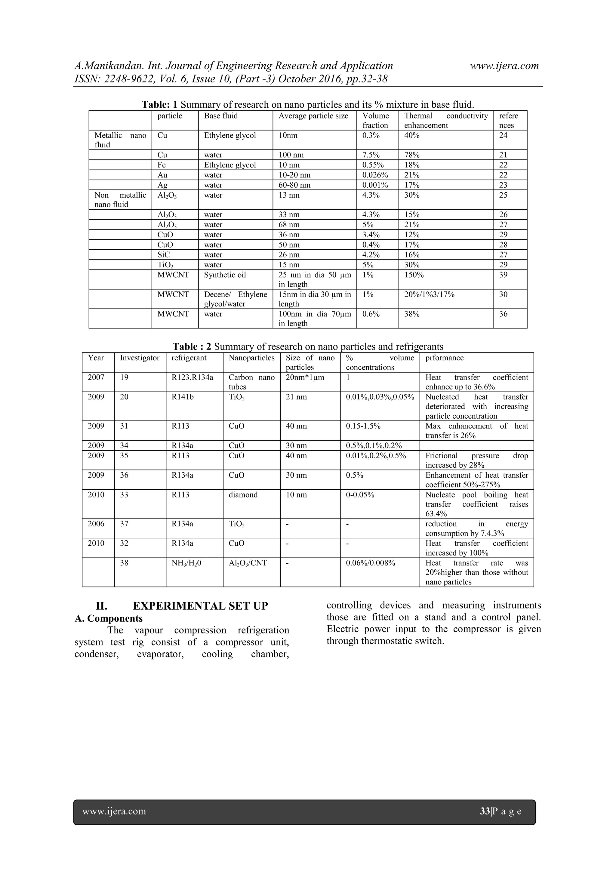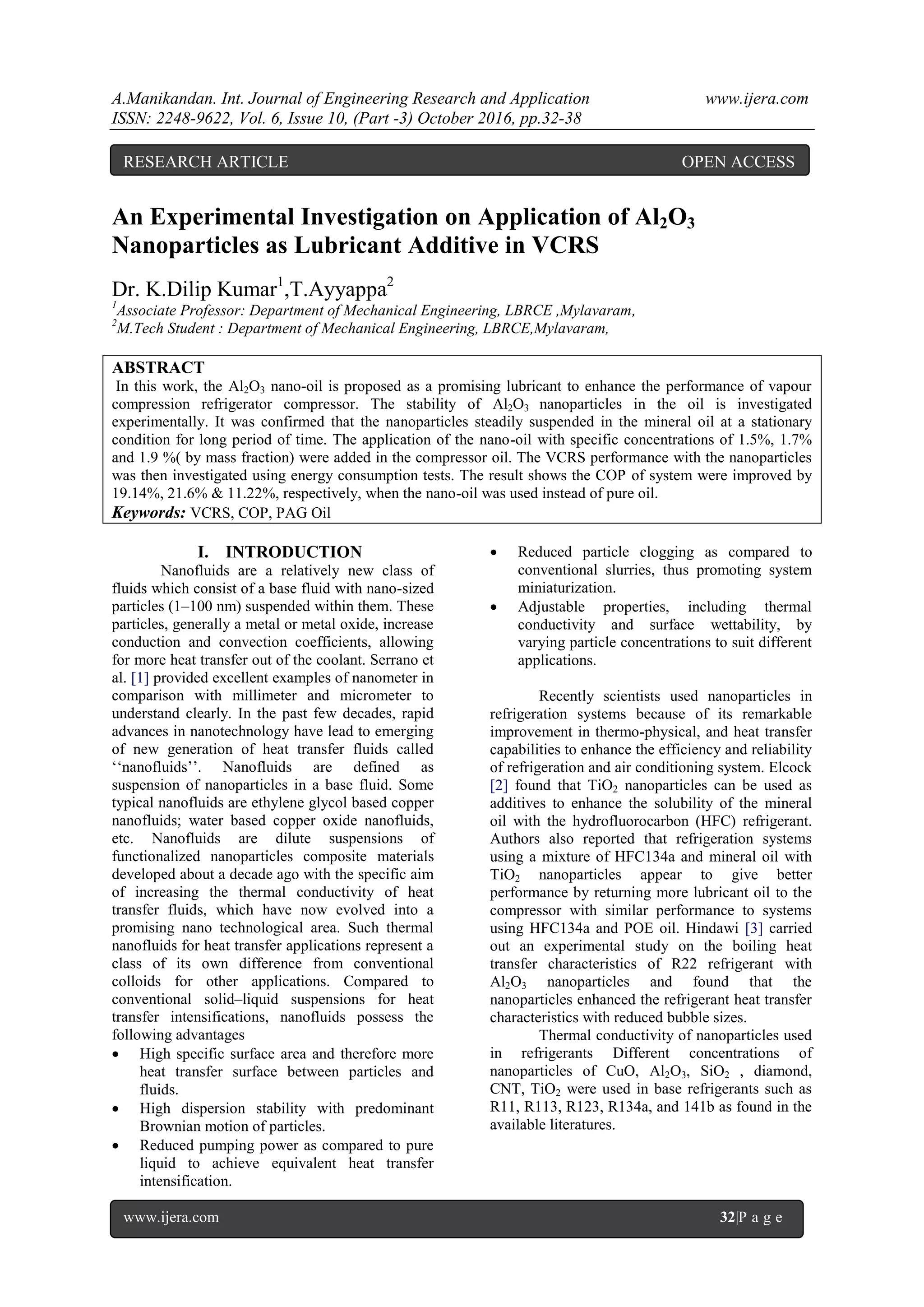 This document investigates the use of Al2O3 nanoparticles as an additive to compressor oil in vapor compression refrigeration systems (VCRS). Experimental tests were conducted adding Al2O3 nanoparticles to PAG oil at concentrations of 1.5%, 1.7%, and 1.9% by mass. Results showed that the coefficient of performance (COP) of the VCRS improved by 19.14%, 21.6%, and 11.22%, respectively, compared to using pure oil. The maximum COP and refrigeration effect occurred at a concentration of 1.7% Al2O3 nanoparticles. Theoretical COP and system capacity were also highest at this concentration. Therefore, adding Al2O3 nanoparticles to compressor oil,