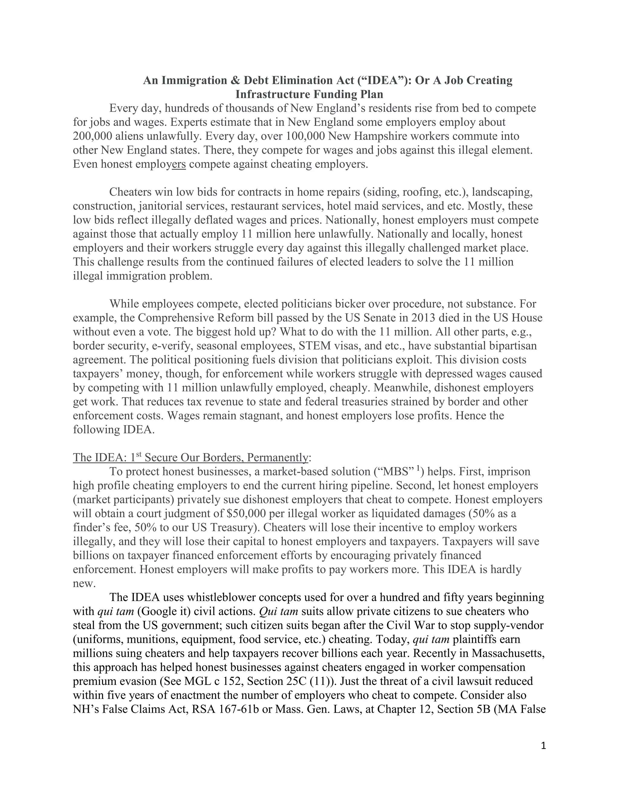 This document proposes an "Immigration & Debt Elimination Act" (IDEA) with several components:
