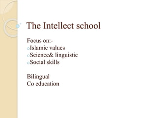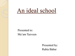 The document outlines a proposal for an ideal school that focuses on Islamic values, science, language skills, and social development. It describes the school's goals of academic excellence, a well-rounded education, and developing students' communication and social skills. Key aspects that are addressed include the school's location, design, educational approach, extracurricular activities, facilities, staff, and evaluation system.