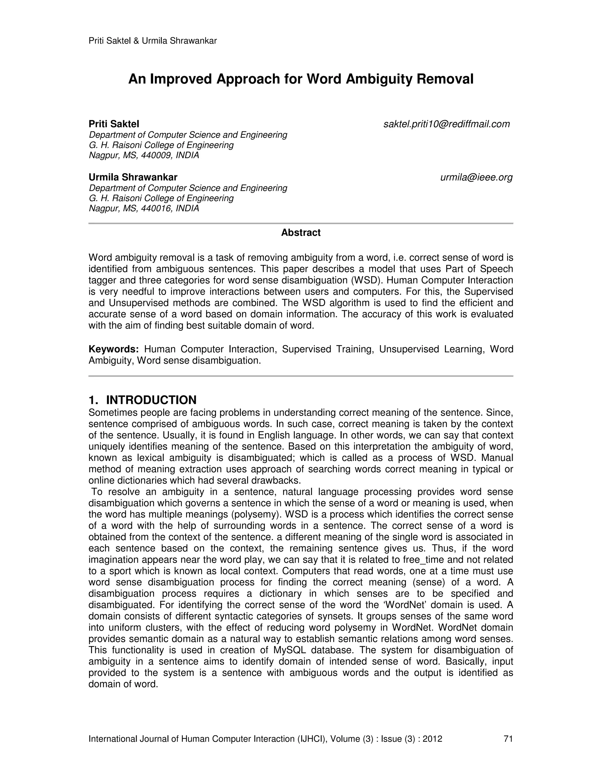 The document presents a model for word ambiguity removal using word sense disambiguation (WSD) techniques that combine supervised and unsupervised methods to improve the accuracy of identifying the correct meaning of words in context. It describes the system architecture which includes a part-of-speech tagger, domain distribution, and an algorithm to disambiguate word meanings based on context, evaluated through various experimental setups. Results indicate improved accuracy rates for word sense identification, particularly with hybrid training methods applied.