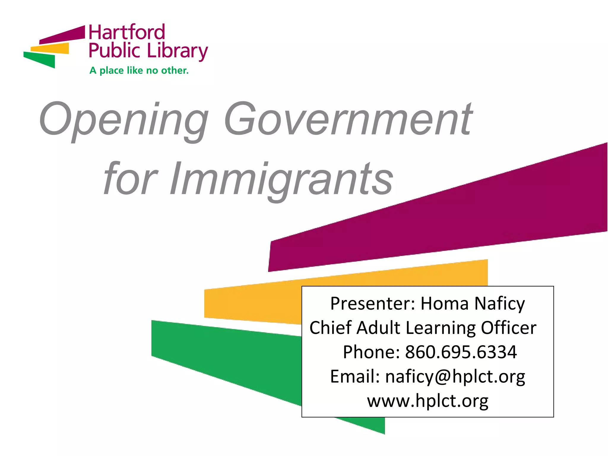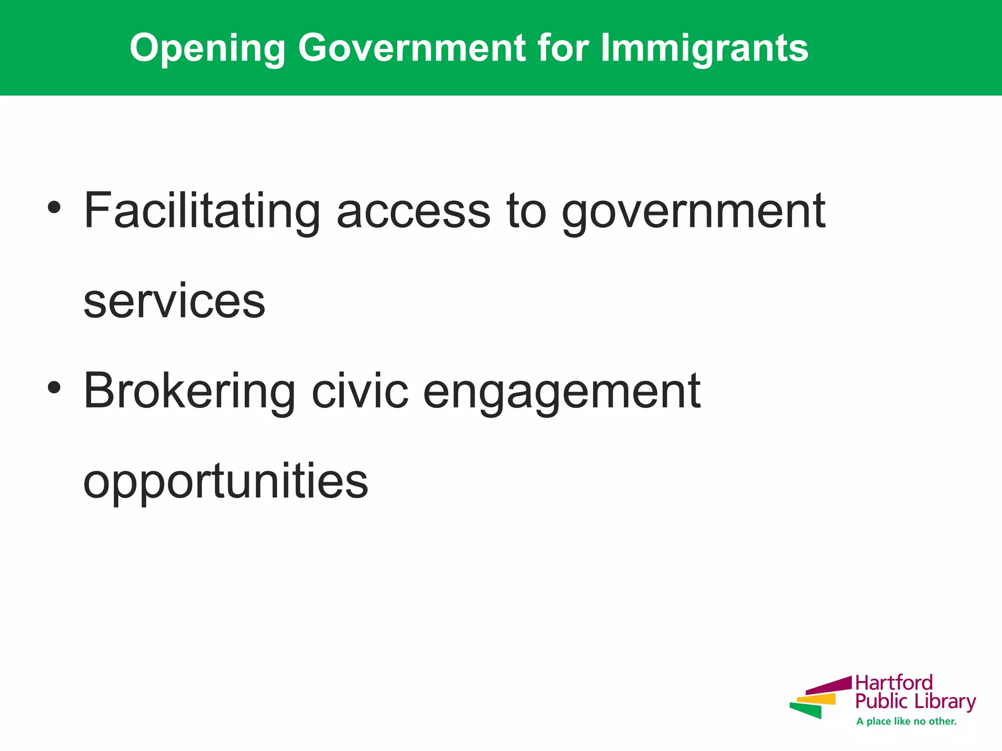 The document outlines initiatives to facilitate access to government services and promote civic engagement for immigrants, highlighting the role of libraries in supporting these efforts. Key strategies include building coalitions, training volunteers as cultural navigators, and community conversations. Funding for these initiatives comes from IMLS and USCIS.