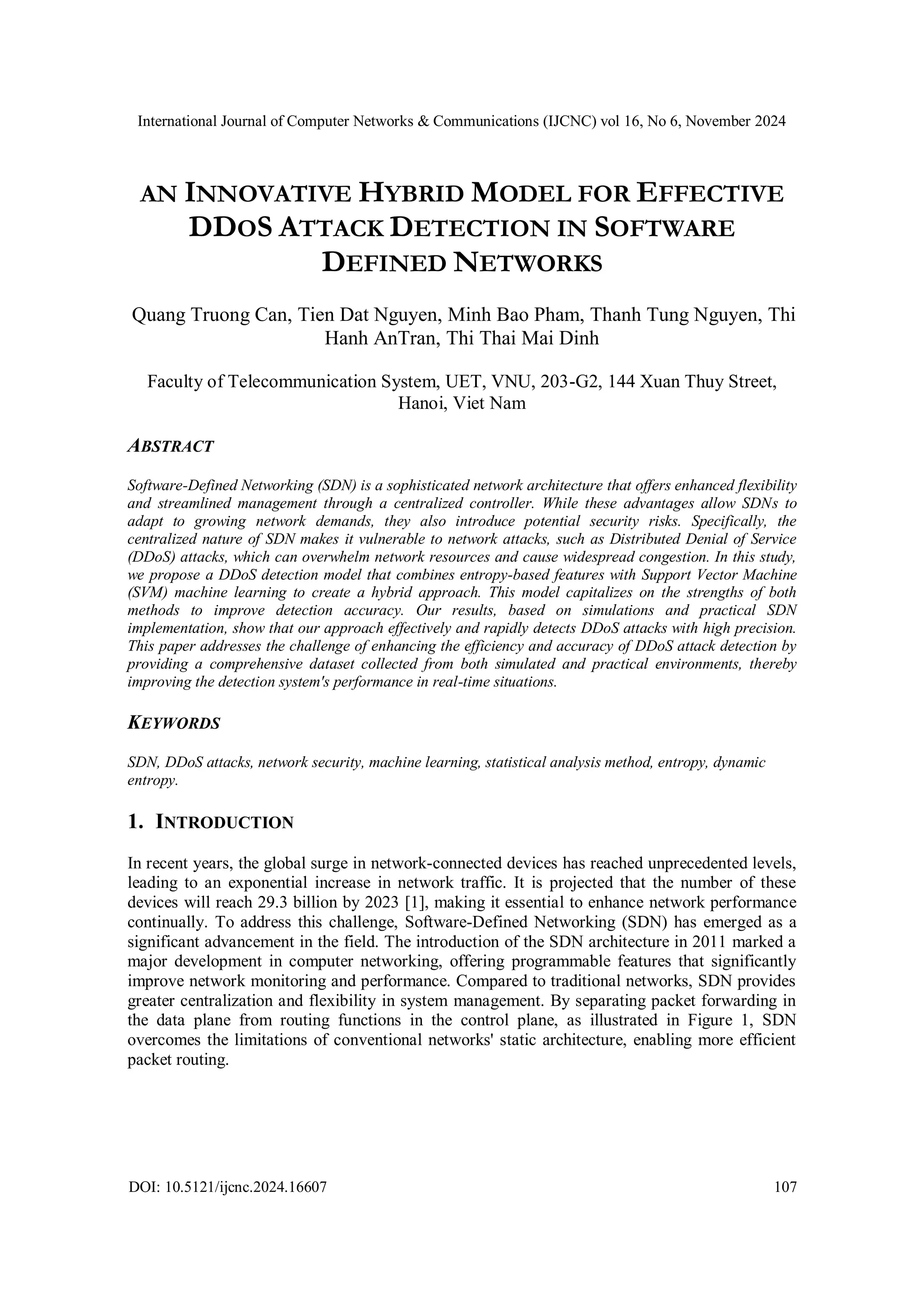 This paper presents a novel hybrid model combining entropy-based features and support vector machine (SVM) techniques for effective detection of DDoS attacks in software-defined networks (SDNs). The proposed model significantly enhances detection accuracy and is validated through simulations and practical implementations, addressing limitations of existing methods that generally operate in simulated environments. By leveraging a dynamic threshold for entropy calculation, the model offers real-time anomaly detection and aims to enhance network security against evolving cyber threats.