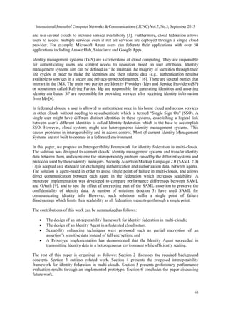 The document presents an interoperability framework for identity federation in multi-cloud environments, addressing the challenges of managing identity and access control across different clouds. The proposed solution implements a Security Assertion Markup Language (SAML) agent to streamline identity assertion requests and enhance scalability while managing heterogeneous identity management systems. Performance evaluations indicate that the developed framework effectively transmits identity data and improves the interoperability of cloud services.