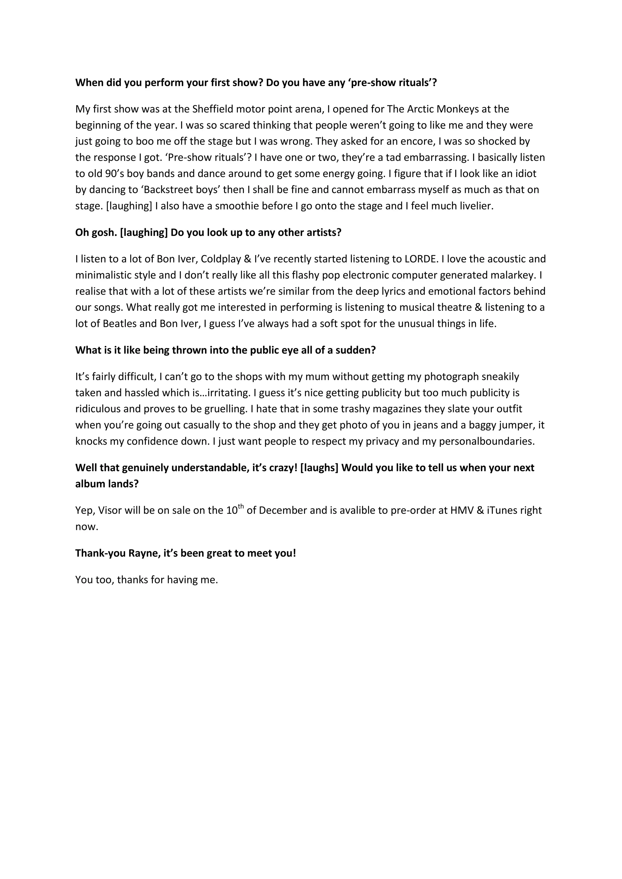 Rayne's debut album "Visor" will be released next month and contains 14 songs with different meanings and moods. She is looking forward to her first worldwide tour next year. Rayne cites "Sheer Perfection" as her favorite song on the album because of its meaningful lyrics about her first crush. While some songs are positive, others reflect negative emotions to achieve a balance like life. Rayne is nervous but excited for her growing public profile and career opportunities.