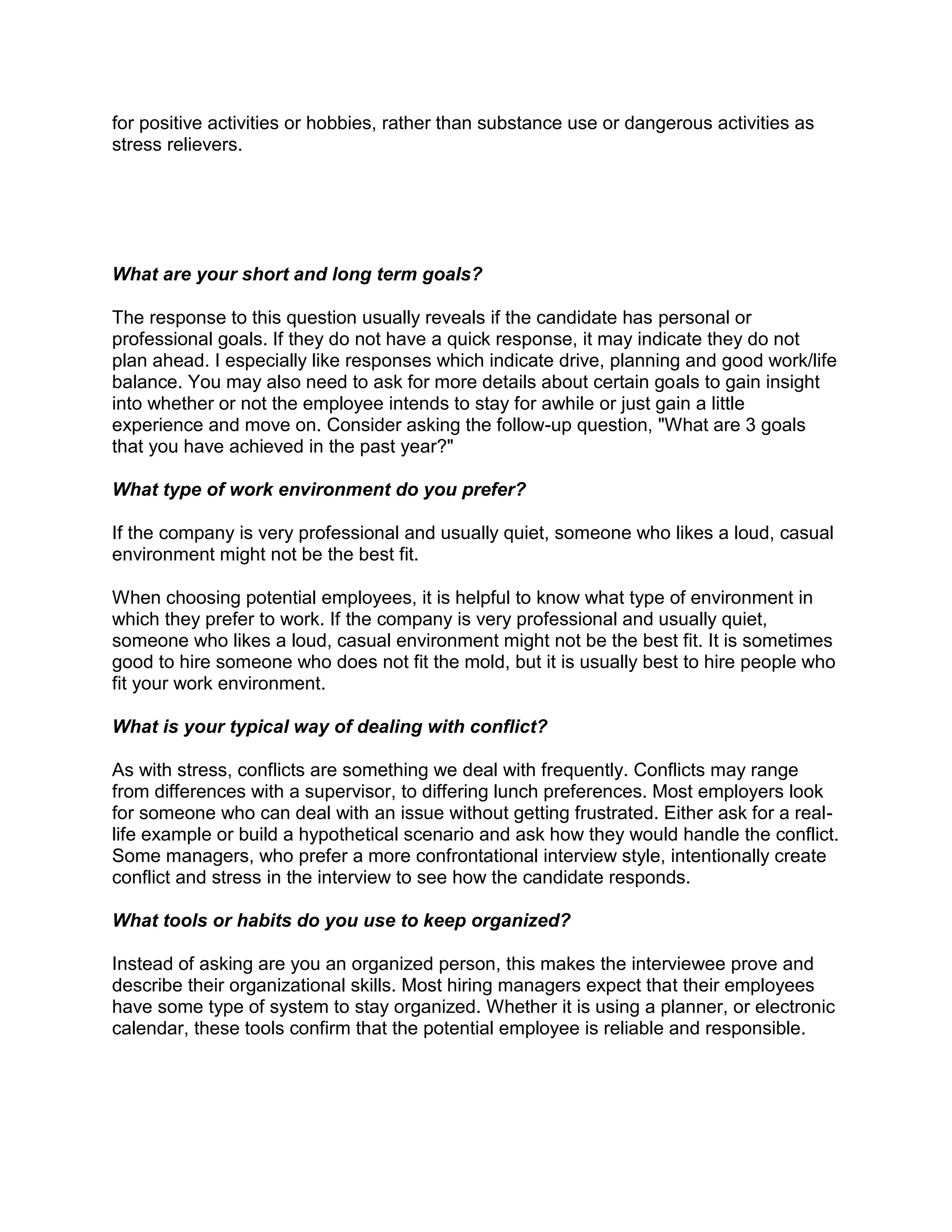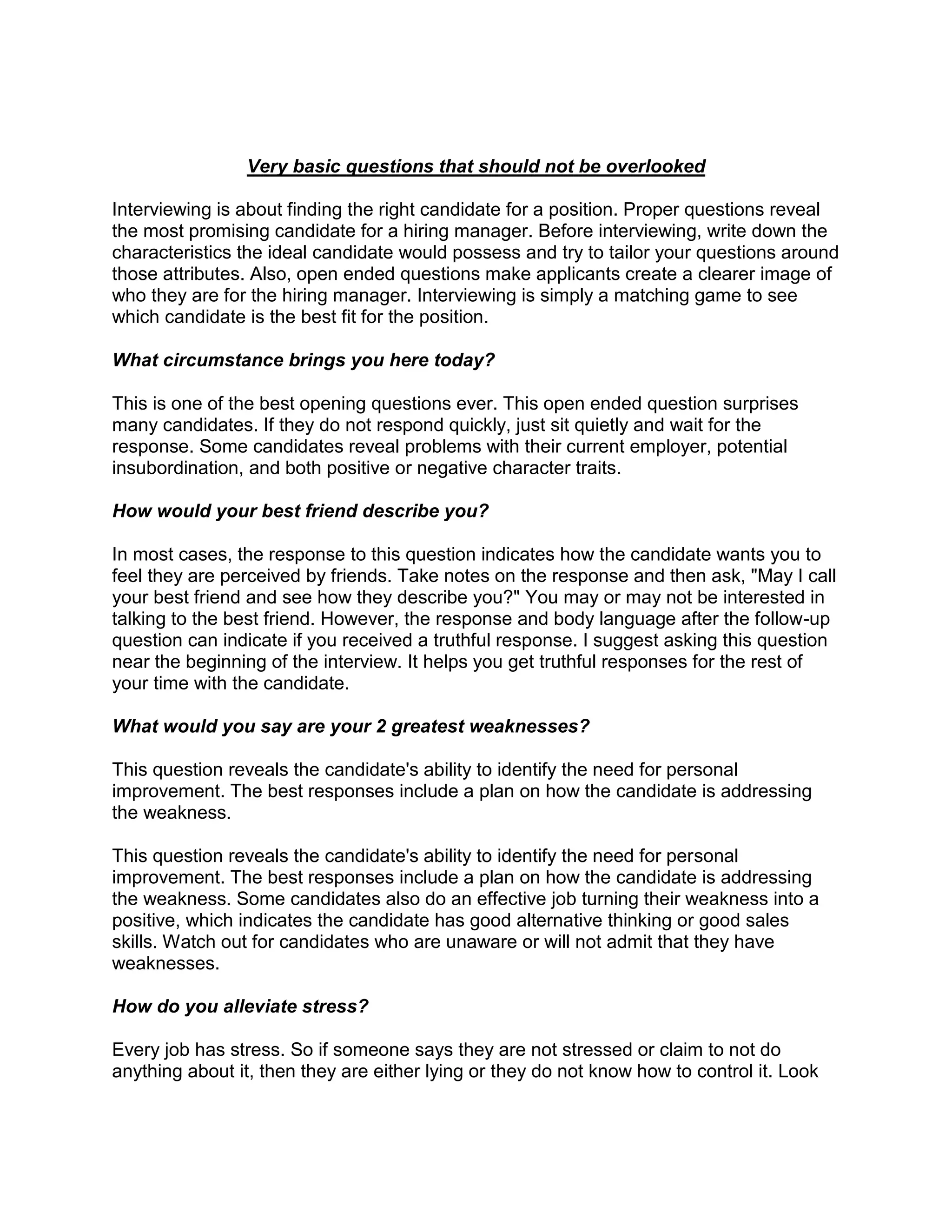 This document provides a list of questions that are useful for interviewing job candidates. Some of the key questions include: "What circumstance brings you here today?", which can reveal problems with a current employer or character traits. "How would your best friend describe you?" which indicates how a candidate wants to be perceived. "What would you say are your 2 greatest weaknesses?" to see if a candidate can identify areas for improvement. The questions help hiring managers evaluate fit for the position and company culture as well as a candidate's qualifications, work ethic, problem-solving and leadership skills.