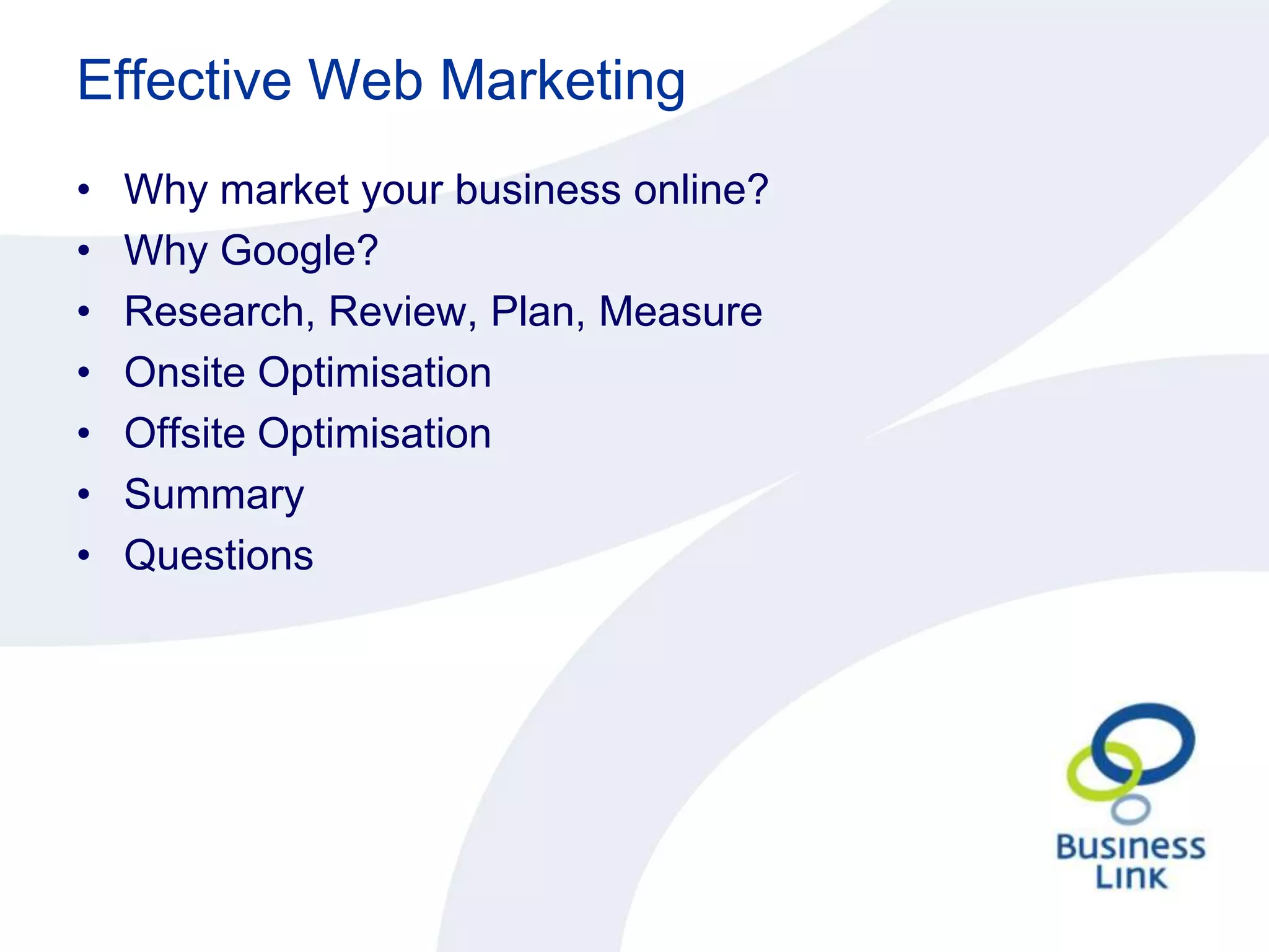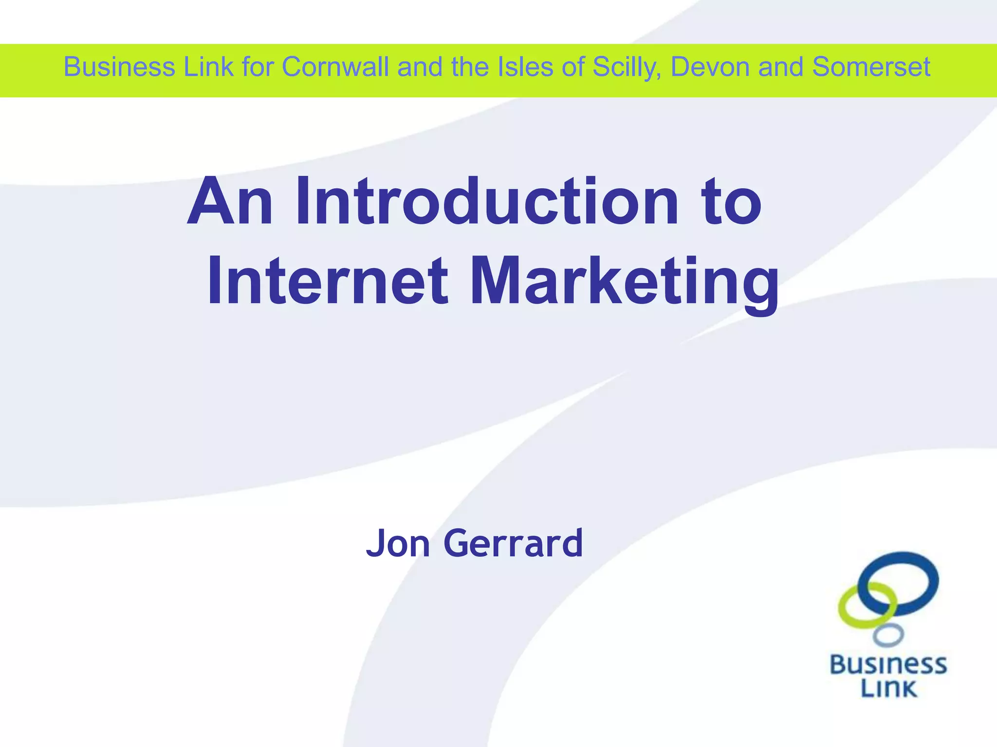 This document provides an introduction to internet marketing. It discusses why businesses should market online, how to optimize websites for search engines like Google, and various online marketing strategies like search engine optimization, social media, email marketing, link building and pay-per-click advertising. It emphasizes researching keywords, reviewing website analytics, implementing on-site optimizations, and monitoring results to improve online visibility and conversions.
