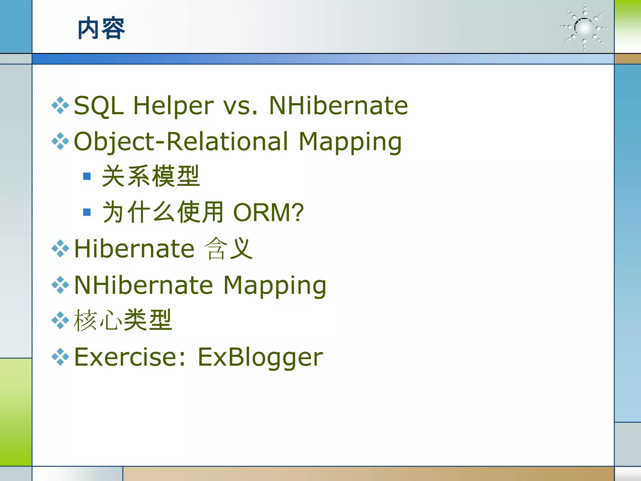 本文件介绍了NHibernate的基础,比较了SQL Helper和NHibernate的优缺点,强调了对象关系映射(ORM)的重要性和概念。文档中包含了NHibernate的核心类型、映射配置以及如何使用NHibernate创建和操作数据对象的示例代码。最终,文档提出了一个多用户博客程序的练习,以巩固这些概念。