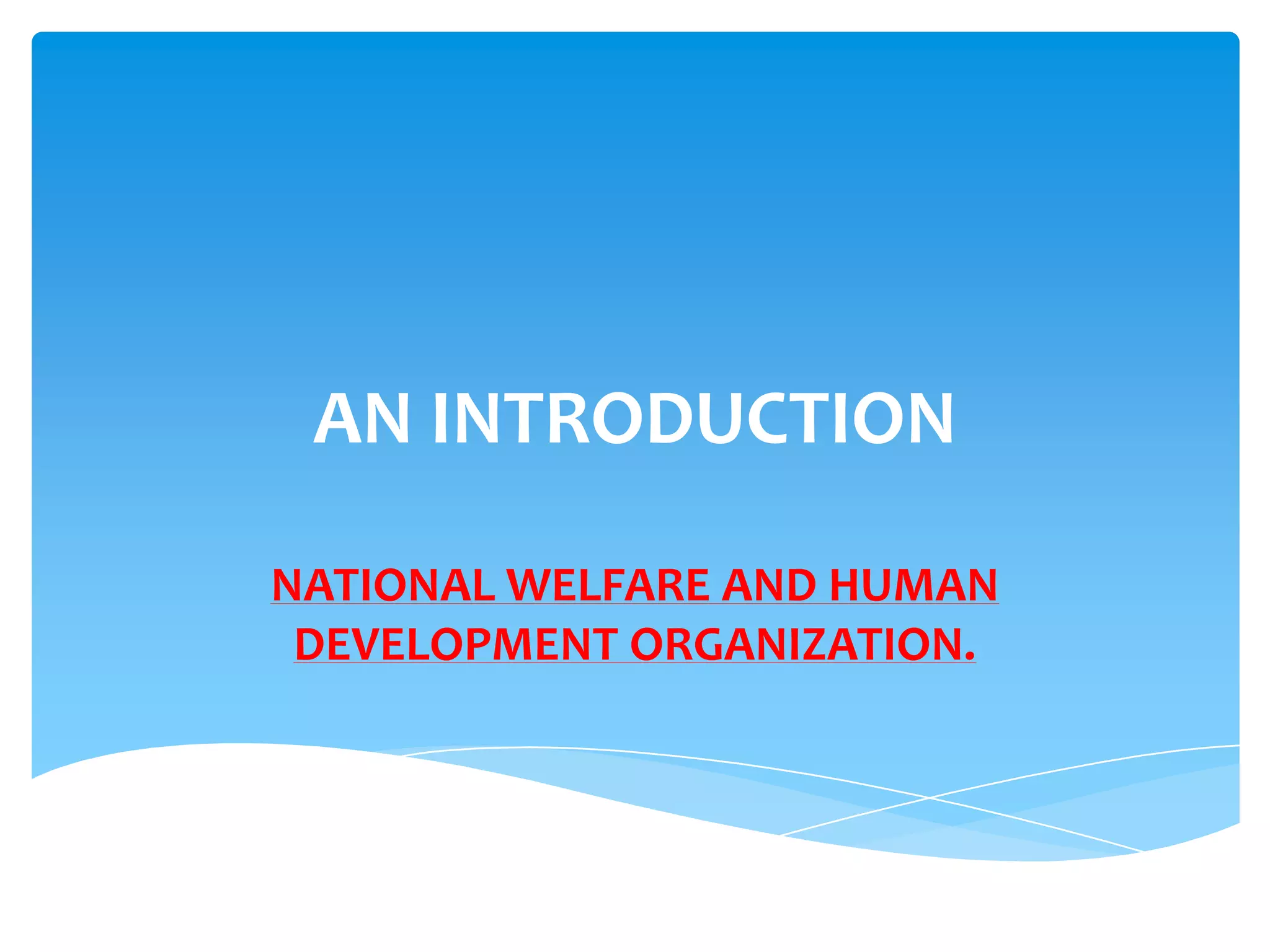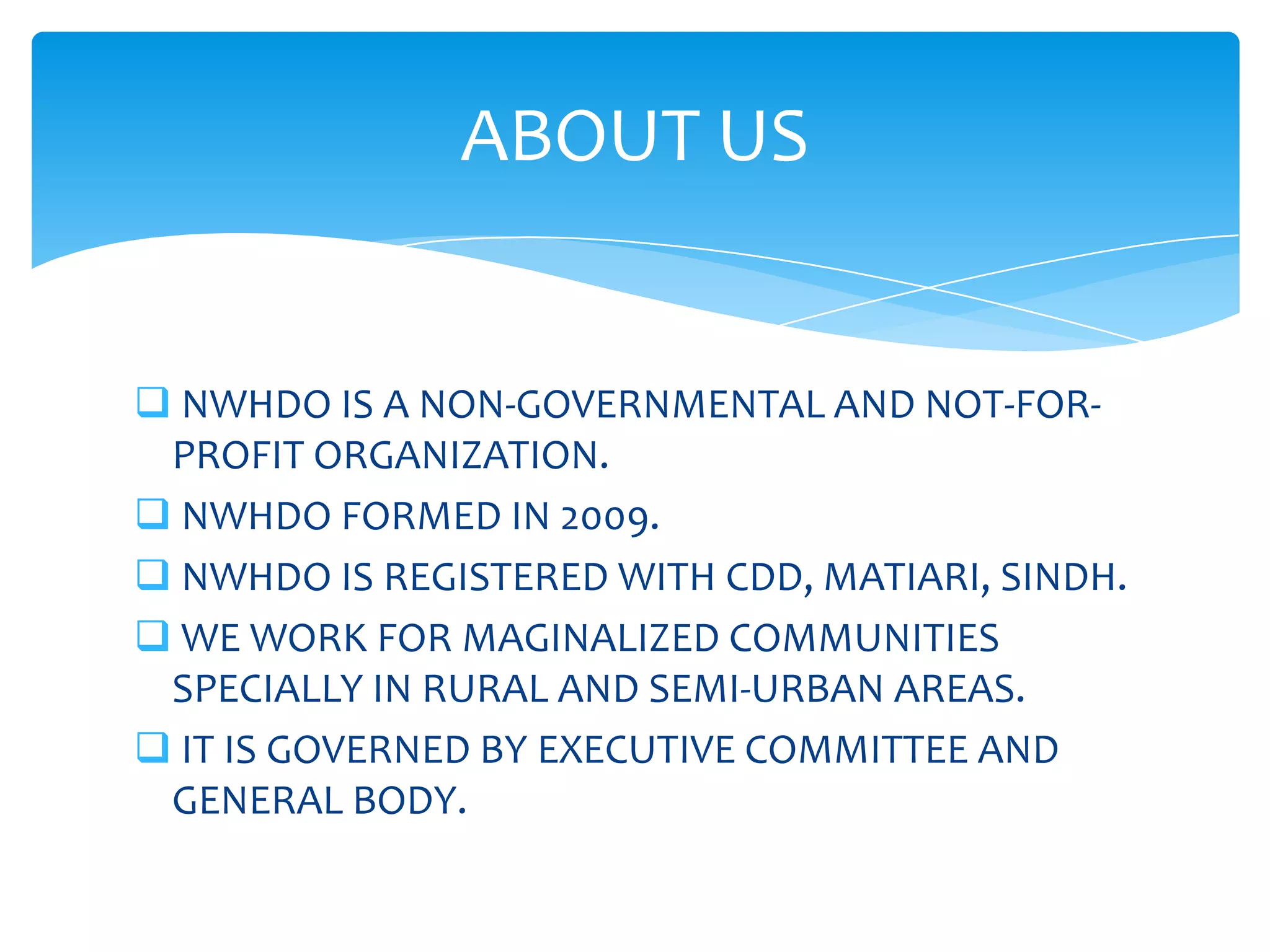 The National Welfare and Human Development Organization (NWHDO) is a non-profit organization formed in 2009 that works to deliver welfare and sustainable human development services to marginalized communities in rural and semi-urban areas. NWHDO's vision is to create a society with better education, health, less poverty, and access to basic needs. Its mission is to deliver these services under themes of education, health, community development, gender equality, poverty alleviation, and training/research. Some of NWHDO's past activities include relief distributions during floods, installing street lights, anti-mosquito campaigns, and medical camps. Future plans include establishing a health unit and girls' computer center.