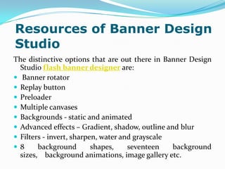 Banner Design Studio is a user-friendly software that allows users to create both static and animated banners without any graphic design experience. It features a variety of templates, over 4000 symbols, and customizable options for banner sizes and effects, making it versatile for different industries. The software simplifies the design process, saving time and costs compared to hiring a professional designer.