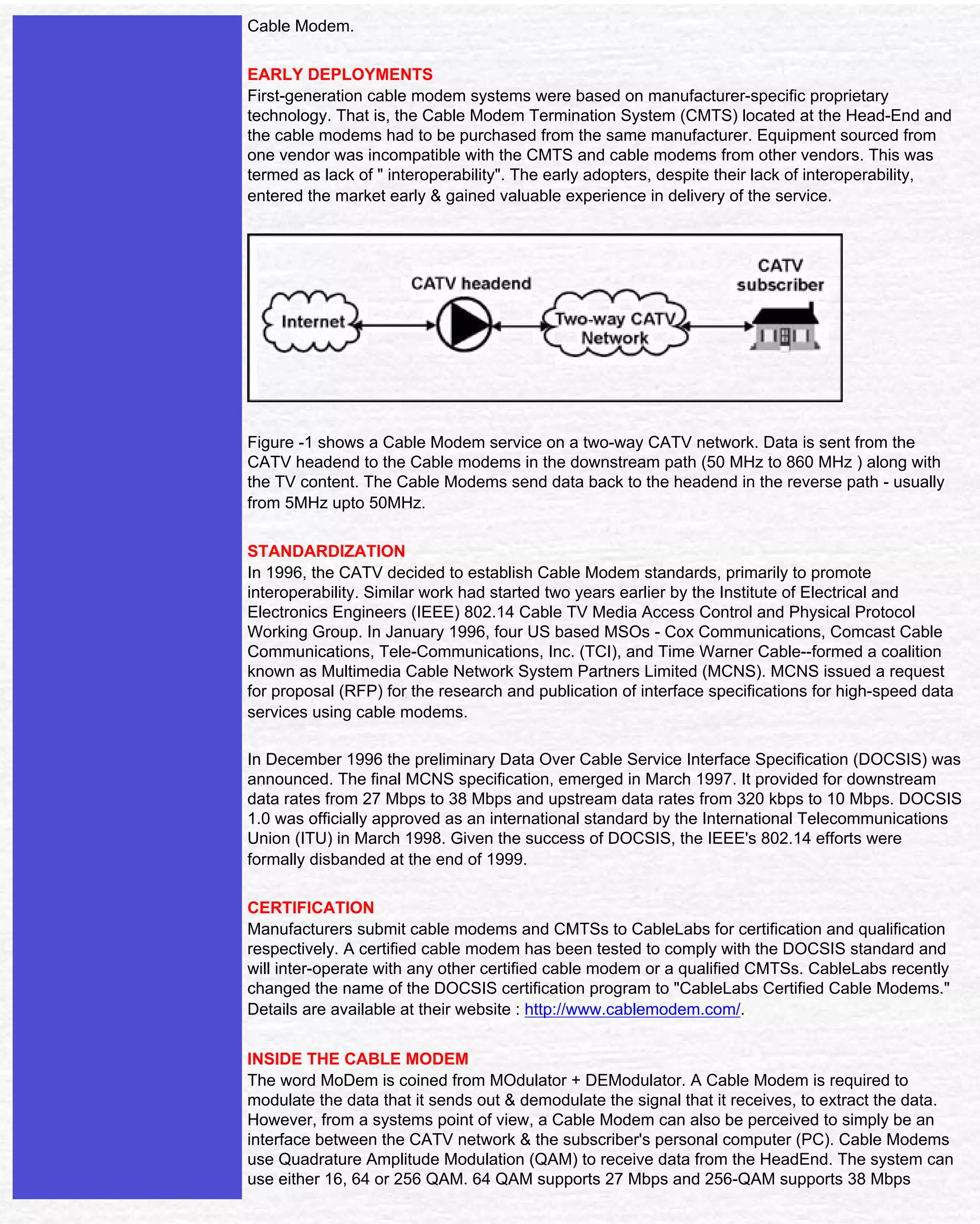 Cable modems allow high-speed internet access over existing cable TV networks. They have the potential to provide internet speeds over 100 times faster than traditional dial-up connections, at a lower cost. Cable modem systems work by sending data downstream from the cable headend to multiple users simultaneously, and sending data upstream from individual users to the headend. Early cable modem systems were proprietary, but standardization under DOCSIS has led to wider adoption and compatibility between equipment from different manufacturers. India is poised for significant growth in cable modem internet users as costs decline from traditional telephone-based access.