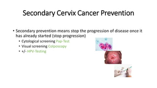 The document provides an overview of colposcopy as a secondary cervical cancer prevention method, detailing indications for the procedure, steps in conducting an examination, and classifications of transformation zones. It outlines the colposcopic signs, terminology, and the importance of teamwork in therapy following findings. Additionally, it emphasizes the need for standardized training in maternal health and gynecology services to enhance care for women.