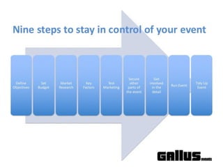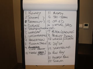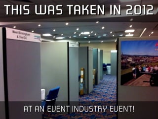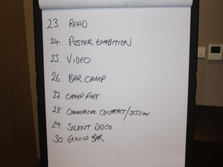 This document outlines an event management training session on making events more creative and engaging. The session covers identifying barriers to creativity, learning structured approaches to event planning, understanding objectives and success metrics, securing key elements like speakers and sponsors, and ensuring events are not boring through creative elements like gamification, technology, and unique networking opportunities. Attendees will work on exercises to apply the lessons to their own events and overcome barriers to making positive changes.