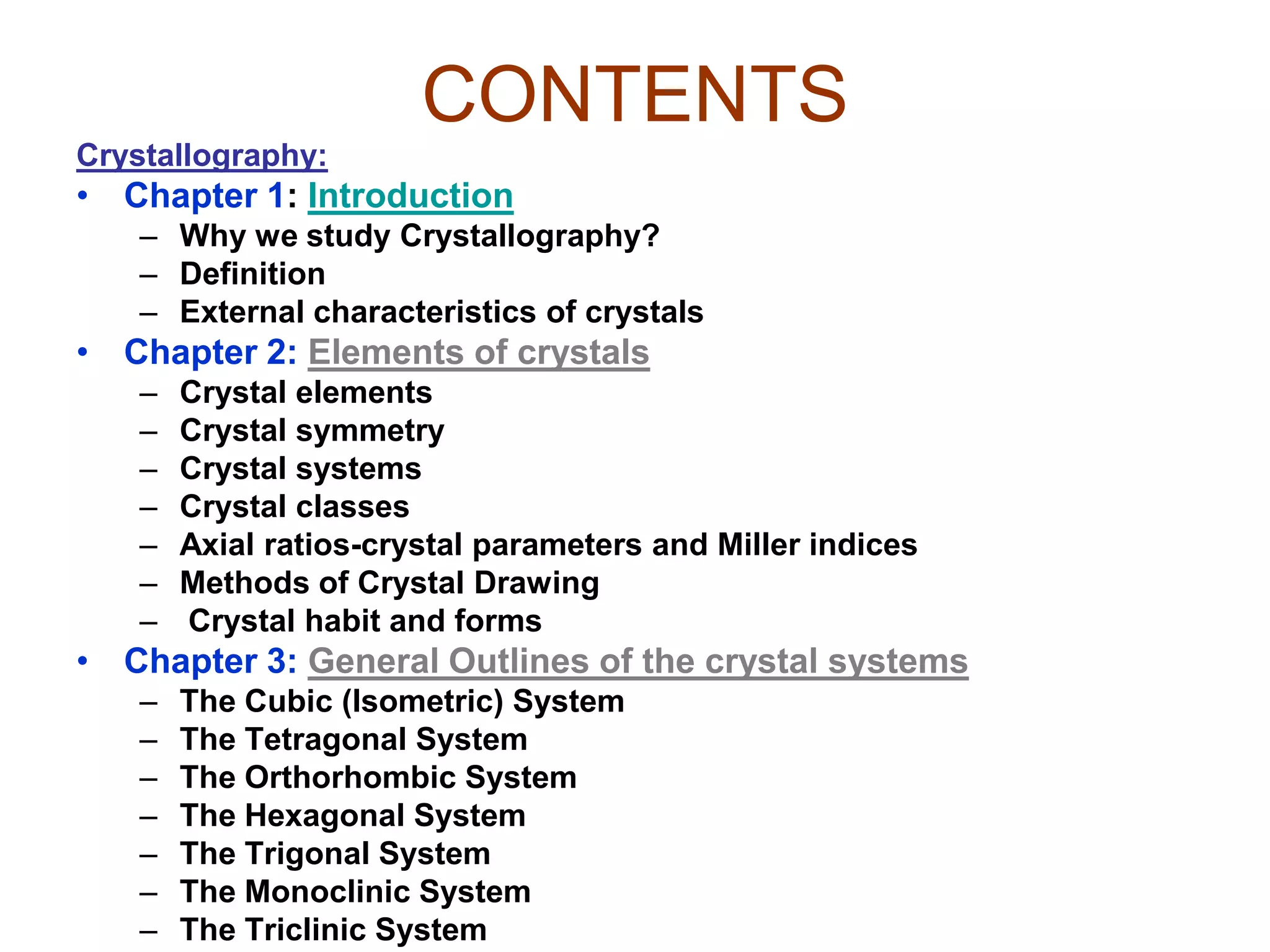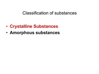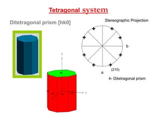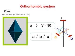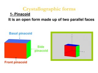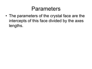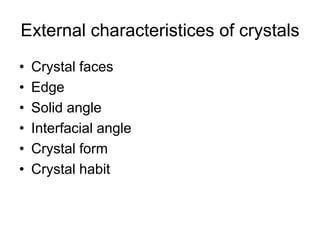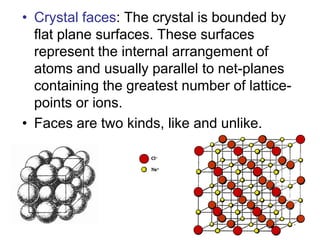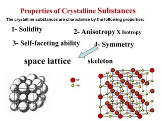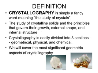This document provides an introduction to crystallography. It defines crystallography as the study of crystals, which are solid substances with regular internal structures bounded by flat planar faces. The document outlines the key elements of crystals, including crystallographic axes, axial angles, crystal systems, symmetry elements, Miller indices, and habits. It also briefly discusses atomic structure, chemical bonding, and polymorphism as relevant concepts in crystallography.