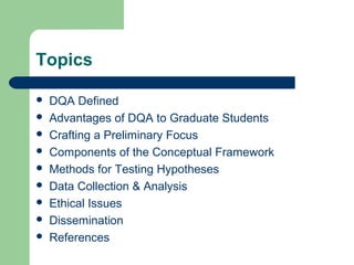 The document introduces deductive qualitative analysis (DQA) as a theory-guided approach to qualitative research, emphasizing the importance of using existing theories and sensitizing concepts from the outset. It outlines the advantages of DQA for graduate students, including its efficiency in research and clear focus, along with processes for theory testing, data collection, analysis, and dissemination. Ethical considerations and the role of reflexivity in the research process are also highlighted.