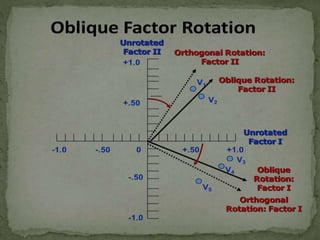 This document discusses exploratory factor analysis (EFA). EFA is used to identify underlying factors that explain the pattern of correlations within a set of observed variables. The document outlines the steps of EFA, including testing assumptions, constructing a correlation matrix, determining the number of factors, rotating factors, and interpreting the factor loadings. It provides an example of running EFA on a dataset with 11 physical performance and anthropometric variables from 21 participants. The analysis extracts 3 factors that explain over 80% of the total variance.