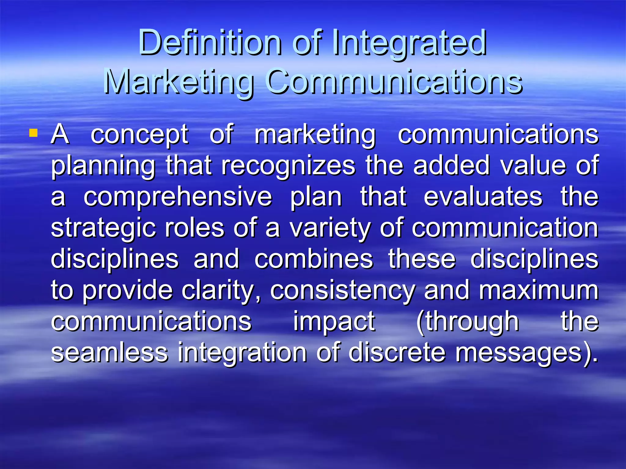 The document defines integrated marketing communications (IMC) as a concept that recognizes the added value of a comprehensive marketing communications plan that combines various communication disciplines to maximize impact. There are two main ideas involved in IMC - ensuring consistency of messaging across different media with "one voice", and integrating communications to simultaneously achieve communication goals like changing attitudes as well as driving behavioral actions like purchases. IMC involves strategically coordinating different communication tools like advertising, direct marketing, digital marketing, sales promotion, publicity, and personal selling.