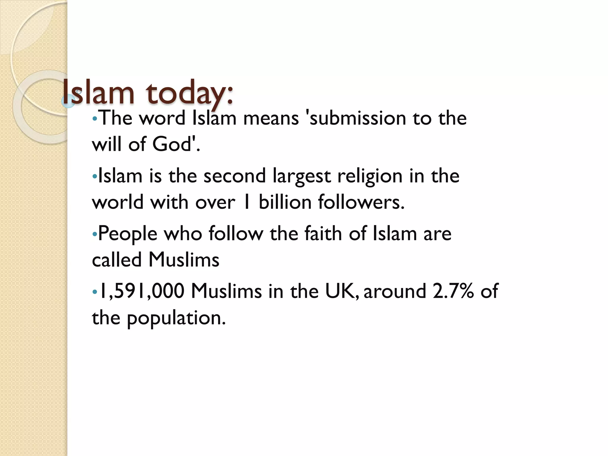 The document provides information about the religion of Islam. It states that Islam is the world's second largest religion with over 1 billion followers who are called Muslims. The core beliefs of Islam include the oneness of God whose name is Allah, and that Muhammad is God's final prophet. The document outlines some of the main aspects of the Islamic faith such as the Quran being the holy book, the 5 Pillars of Islam including prayer and fasting, festivals like Eid, rules around mosques and the importance of the pilgrimage to Mecca.