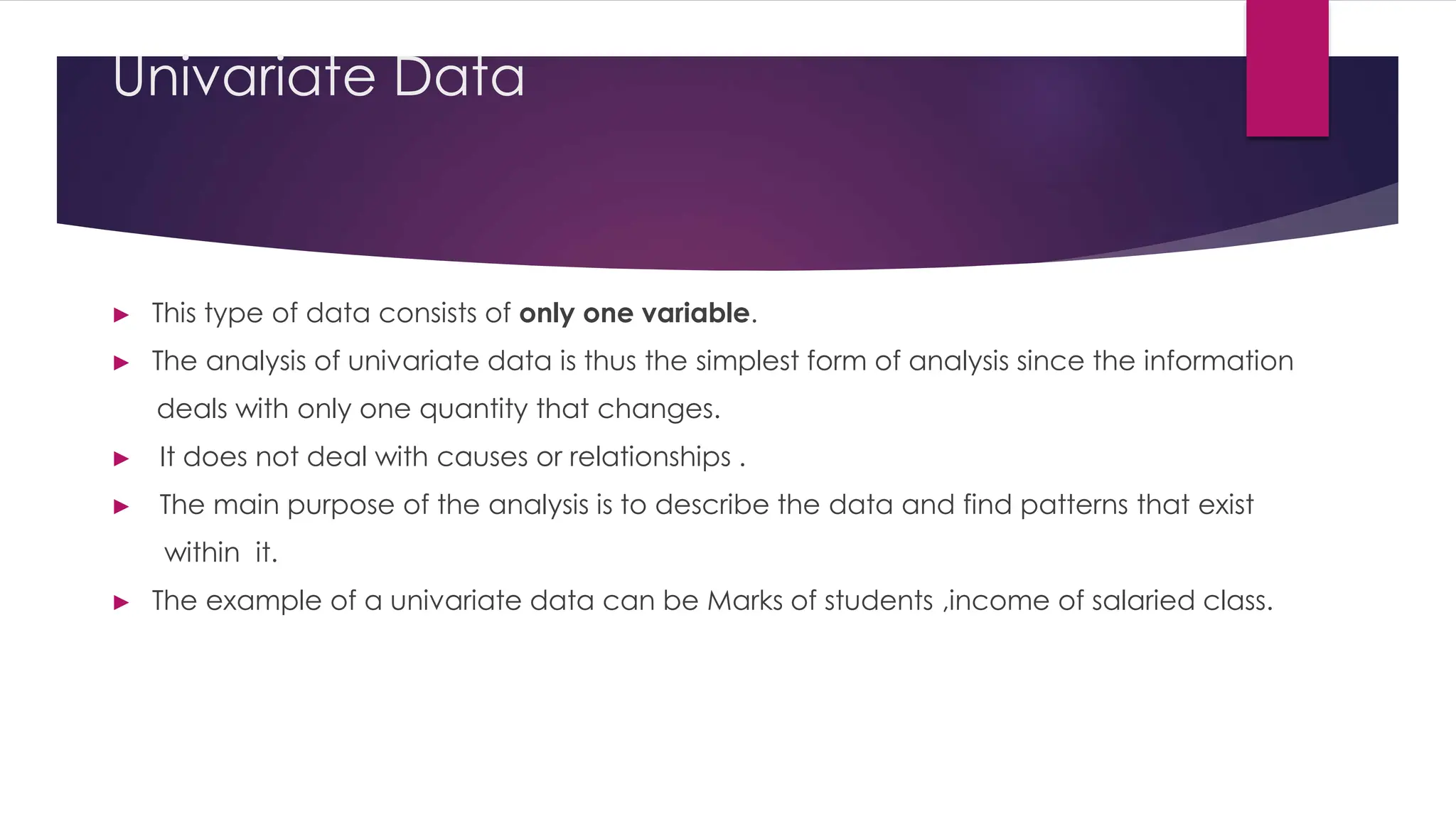 The document describes types of data analysis: univariate (one variable), bivariate (two variables), and multivariate (more than two variables), emphasizing the differences in complexity and relationships among variables. It highlights the purpose of multivariate analysis, which is to explore interdependencies and relationships among multiple variables, useful in various fields including economics and psychology. Techniques discussed include principal components analysis (PCA) and factor analysis (FA), focusing on data reduction and covariate relationships.