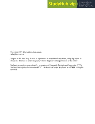 This document provides an introduction and overview to the textbook "An Introduction to Numerical Methods Using Mathcad" by Khyruddin Akbar Ansari. The textbook is designed as a guide for teaching numerical methods using Mathcad software. It covers topics such as root-finding, matrices, interpolation, curve-fitting, differentiation, integration, and solving differential equations. The author has many years of experience in engineering education and research.
