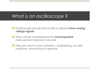 An oscilloscope is a key measurement device used to observe time-varying voltage signals across various fields such as engineering and medicine. There are three main types: analog oscilloscopes, digital oscilloscopes, and USB oscilloscopes, each with different functionalities and capabilities. Essential characteristics include bandwidth, which indicates the maximum measurable frequency, and sampling rate, determining the speed of data acquisition.